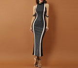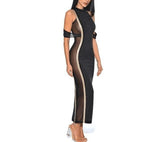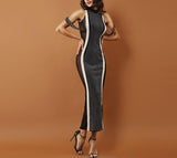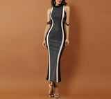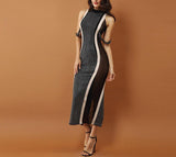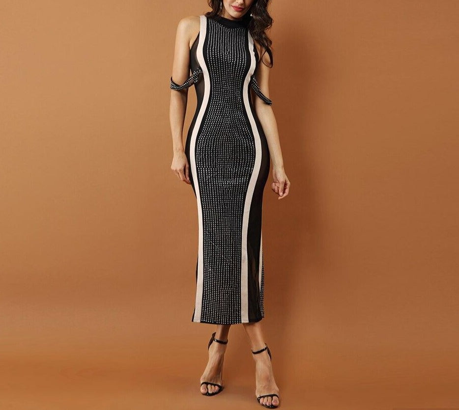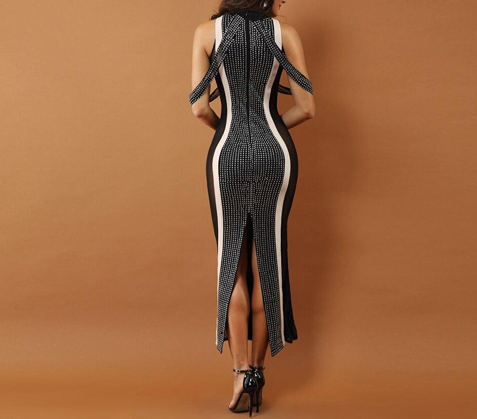 The 1970’s glam is featured on this rhinestone-covered dress. Plunge back and hook fastening neckband. Tight fitting bodice and soft and tight skirt. Zipper fastening at centre back.