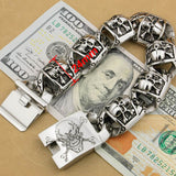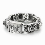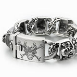 416L Stainless steel bracelet engraved with iconic skull on the buckle. Featuring square links with a skull and bones engraving.