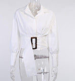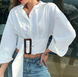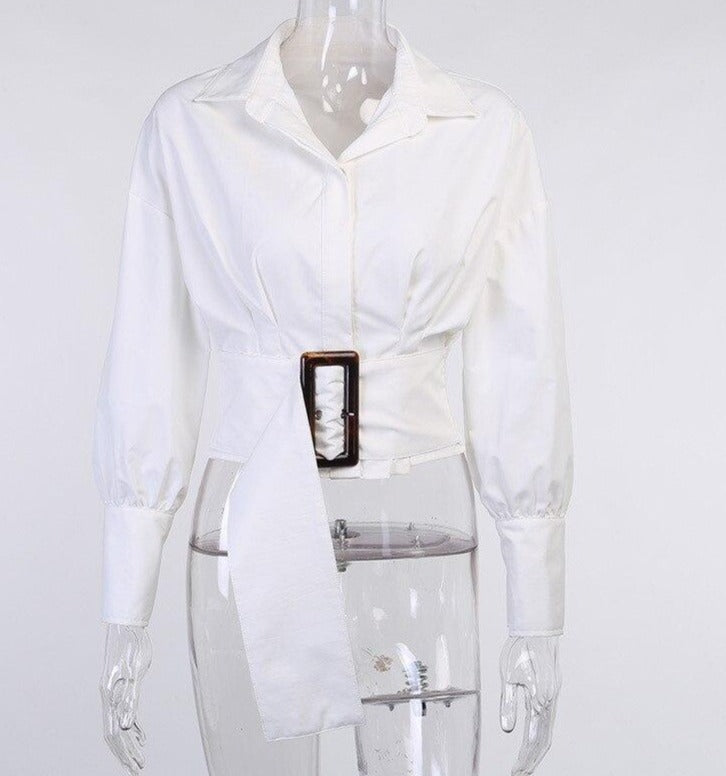 This lurex shirt features a large waist band with large metal buckle. Mother-of-pearl button fastening.