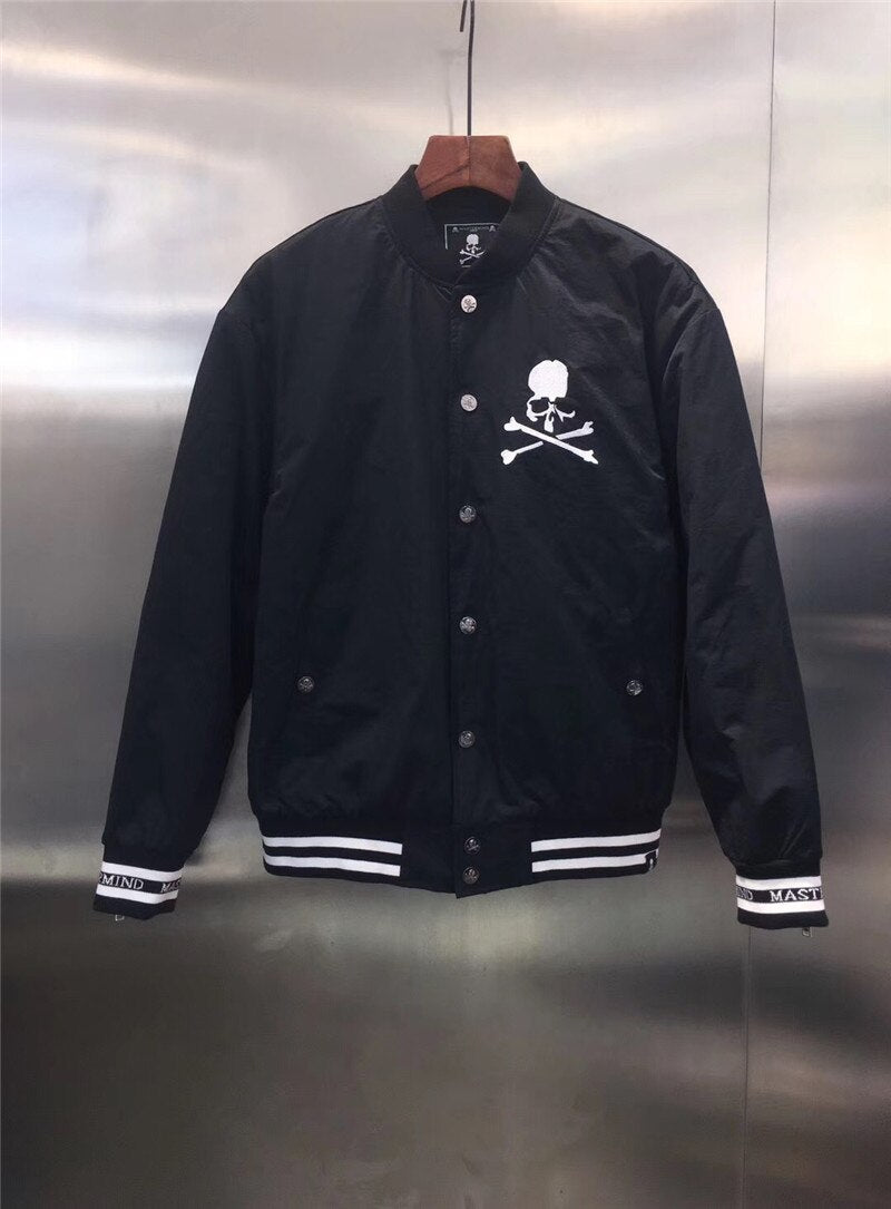 The main feature of this nylon bomber are numerous pockets and the skull. The terry-stitch embroidery of the brand’s lettering is featured on the patch sewn at yoke. Zipper fastening. Woven ribbed collar, cuffs and bottom hem with striping. Padded and quilted lining.
