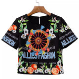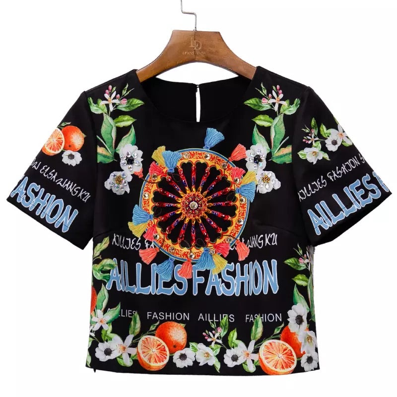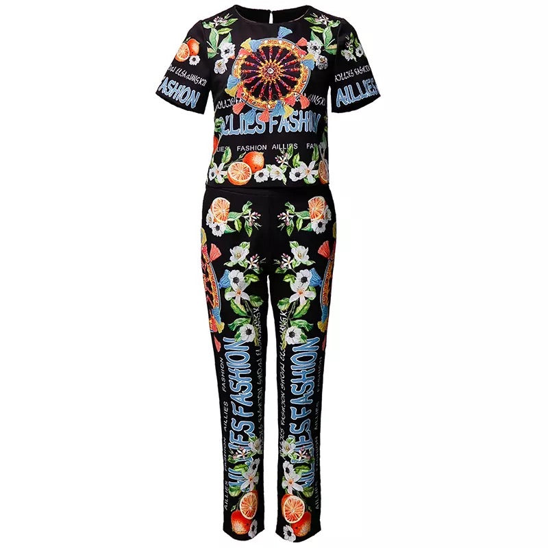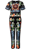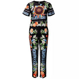 Cotton short sleeve jumpsuit. Banded waist. Two needle stitching. Floreal embroideries thoughout the 2 pieces set.