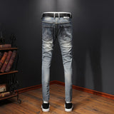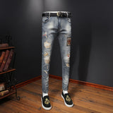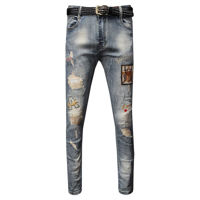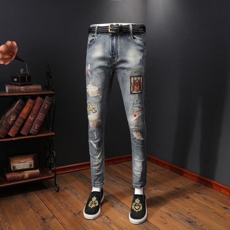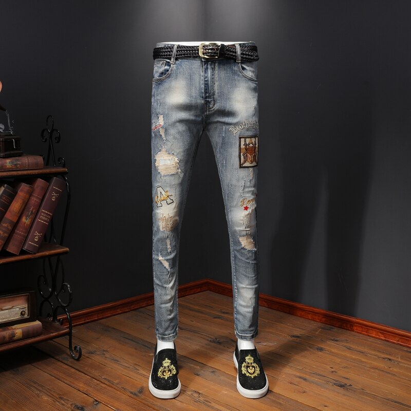 Scratches and rips are the main feature of these stone washed denim 6 pocket pants. Patches with the brand’s lettering embroidery and decorated with studs are sewn on the left leg. Metal buttons fastening. The Maison’s lettering is embroidered under the rear waistband. Two needle stitching. Fit: Straight.