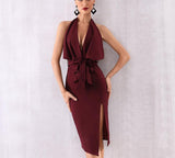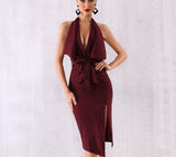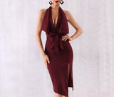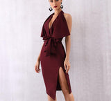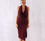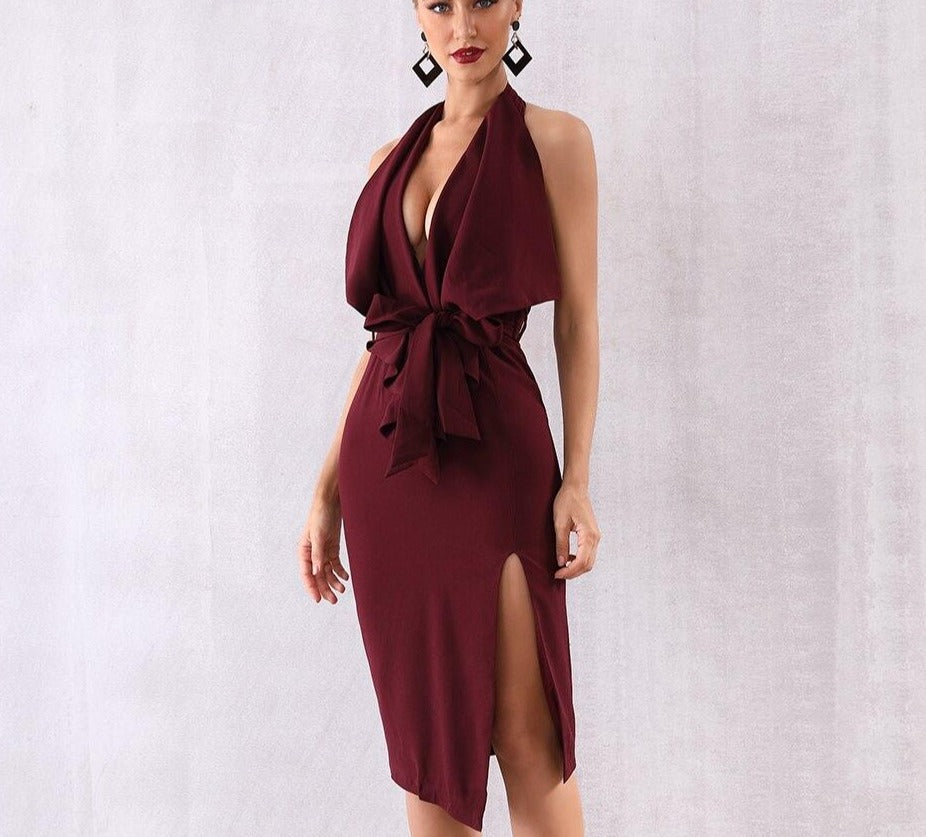 Velvet and lurex sleeveless dress with a plunging neckline and low back. A drape can be used as a ribbon-like belt to highlight the waist and straight pleated skirt. Zipper fastening at centre back.