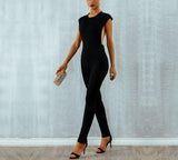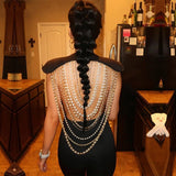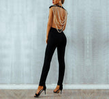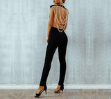 Matte satin sleeveless romper with silk details. The garment shines with delicate and symmetrical design. Zipper fastening at centre back.The 70’s glam is brought back by this silk cady long open shoulder dress. Cut off back covered in pearl counterwights necklaces. Zipper buttons fastening at centre back.