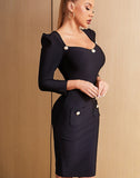 Button enriched long sleeve dress. A set of golden buttons remark the chest and sleeve attachment. Concealed zipper fastening on the center back. Throughout printed inner lining.