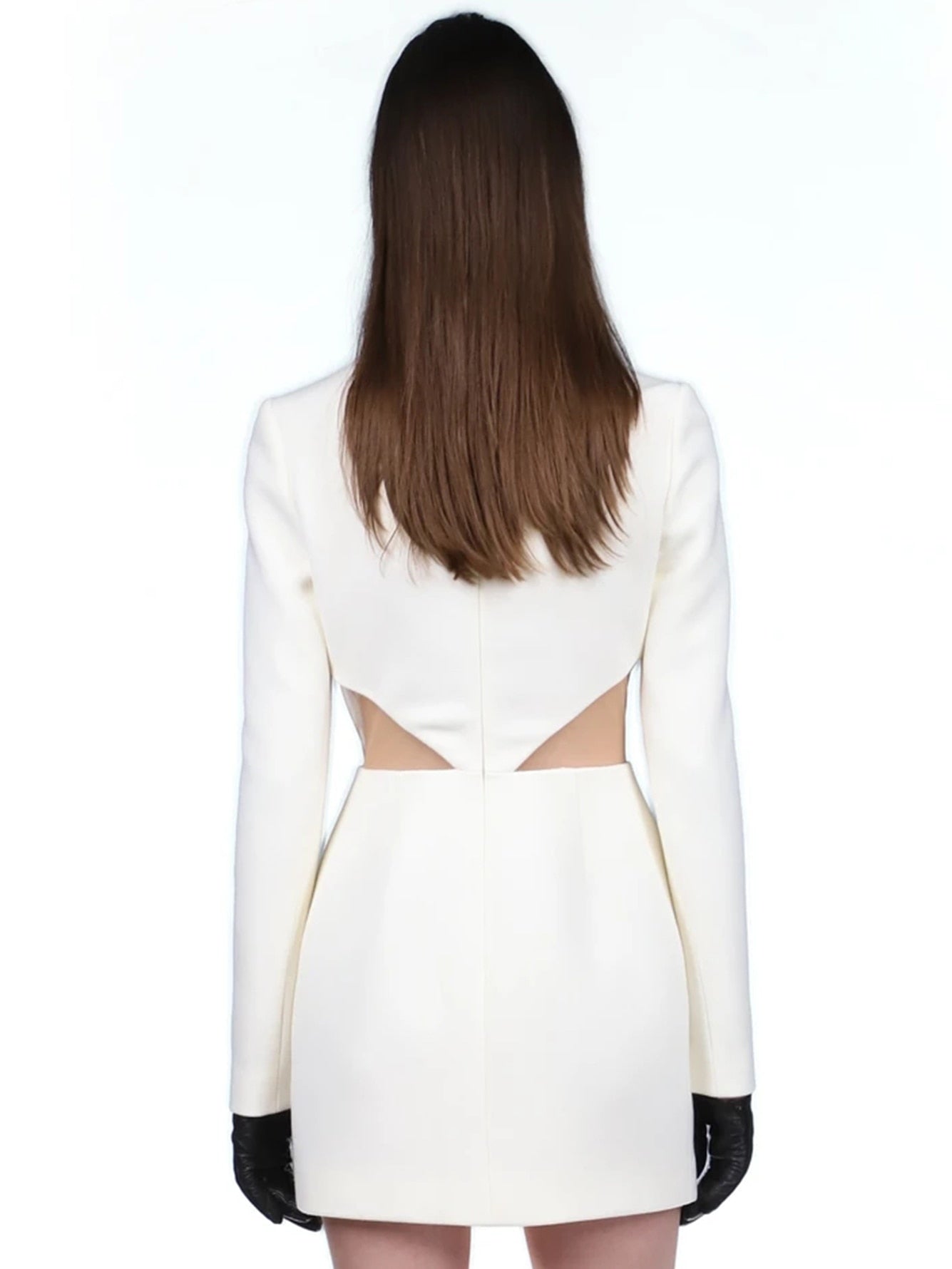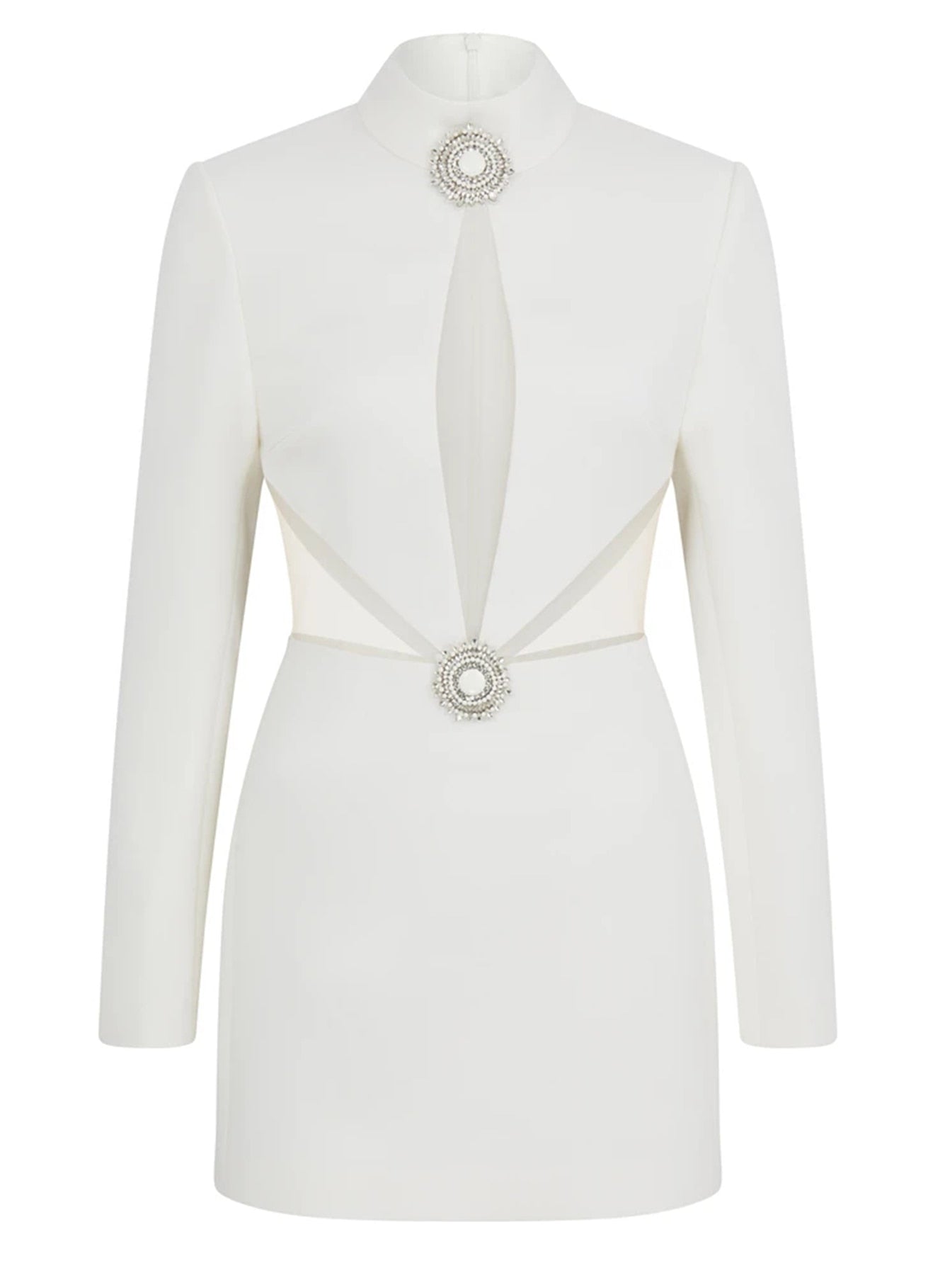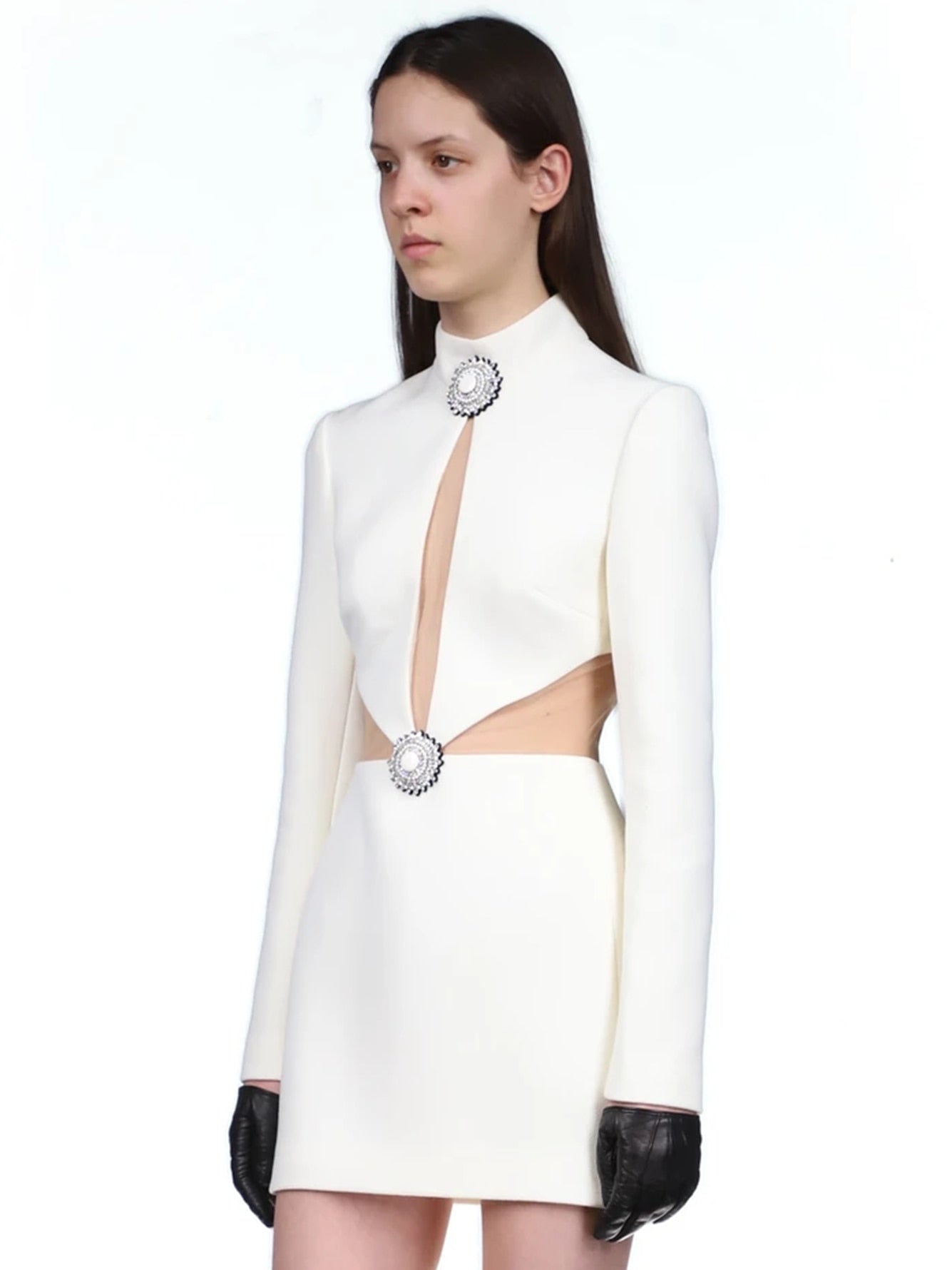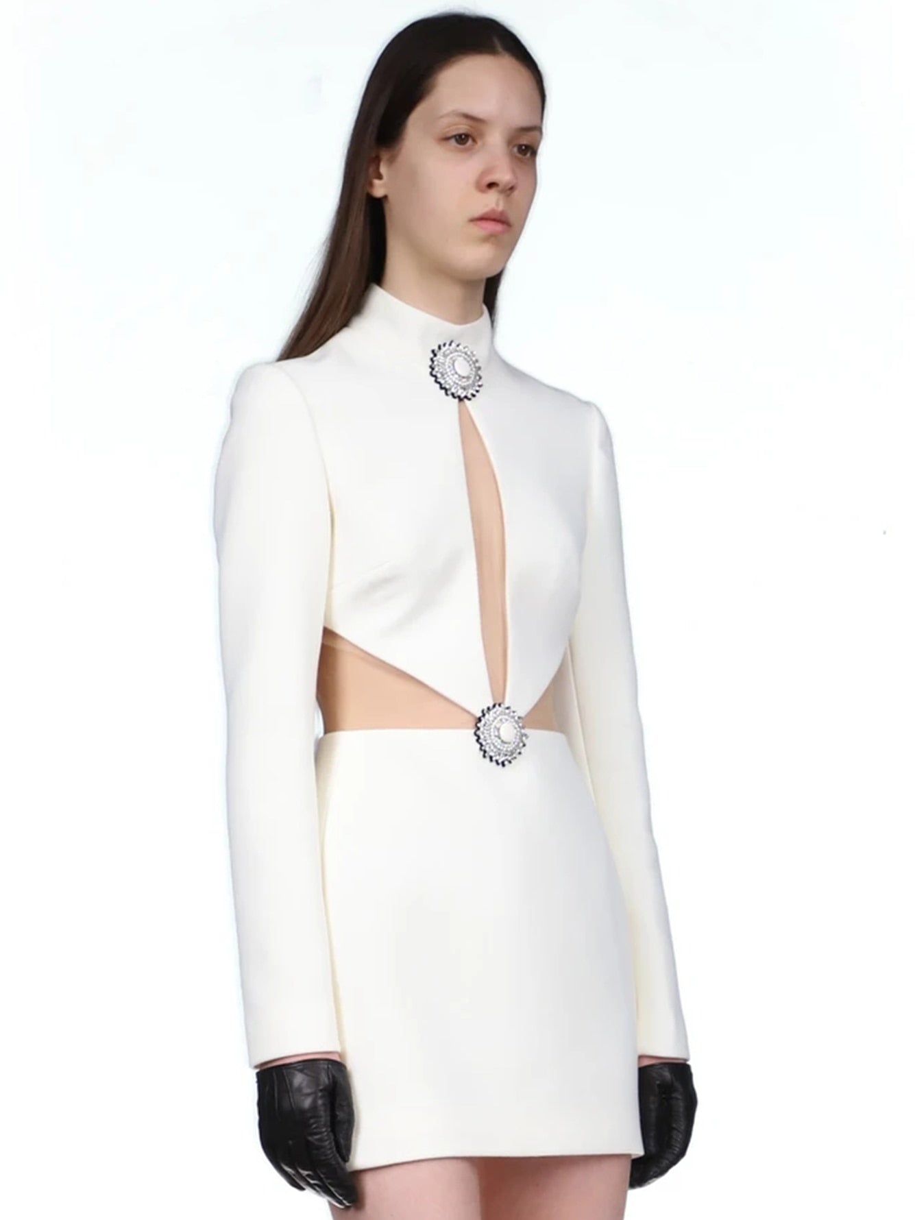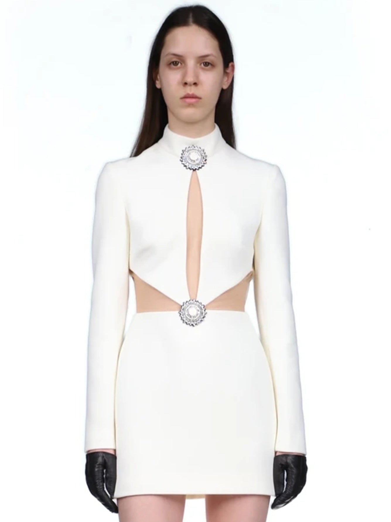 Simple yet unique design for this jewels enriched stretch viscose jersey evening dress. Symmetrical neckline with decorative bra. Central jewels to secure the turtleneck band and waist line. Straight skirt. Zipper fastening at centre back.