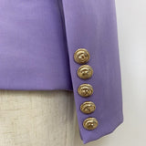 The classic and simple lines of this viscose blend sand cady double-breasted jacket are overturned by retro details. Double-breasted blazer. Tight-fit, the concave shoulders and the large peak lapel remind of Bianca Jagger’s 70’s style. Metal jewel buttons fastening. Two flap pockets. Jungle-print lining.