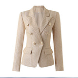 The classic and simple lines of this viscose blend sand cady double-breasted jacket are overturned by retro details. Its tight-fit, concave shoulders, and large lapel remind of Bianca Jagger’s 70’s style. Metal jewel buttons fastening. Two flap pockets. Simple-print lining.
