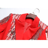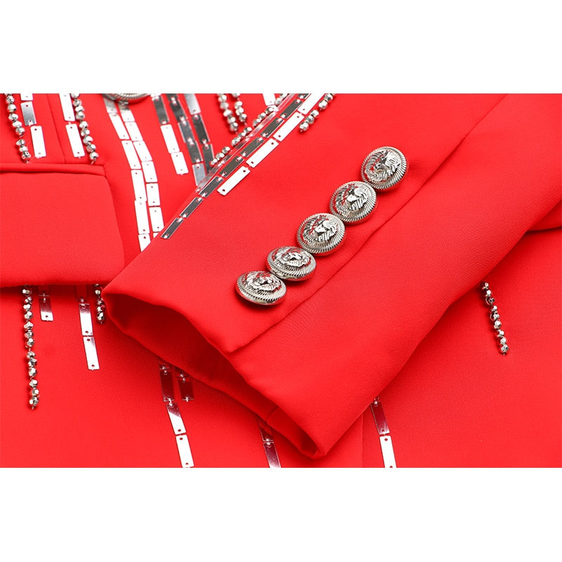 The classic and simple lines of this viscose blend sand cady double-breasted jacket are overturned by retro details. Its tight-fit, concave shoulders, and large lapel remind of Bianca Jagger’s 70’s style. Metal jewel buttons fastening. Two flap pockets. Black-print lining.