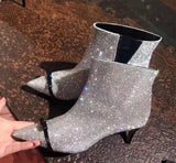 Rock vibes for these crystal-covered suede booties. Zip-up fastening on the side. Jewel skull skewered in the iron stiletto. Nappa footbed. Genuine leather sole. Heel: 40 mm.