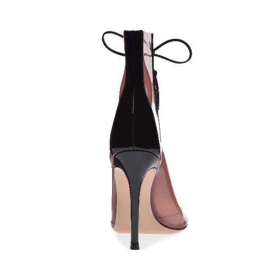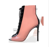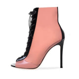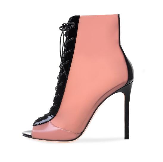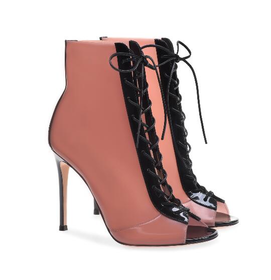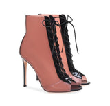 These leather boots feature a leather front lined lace up fatening. Two tone patterened leather. flat heel. Nappa lining. Opened toe cap. Genuine leather sole. Heel: 80 mm.