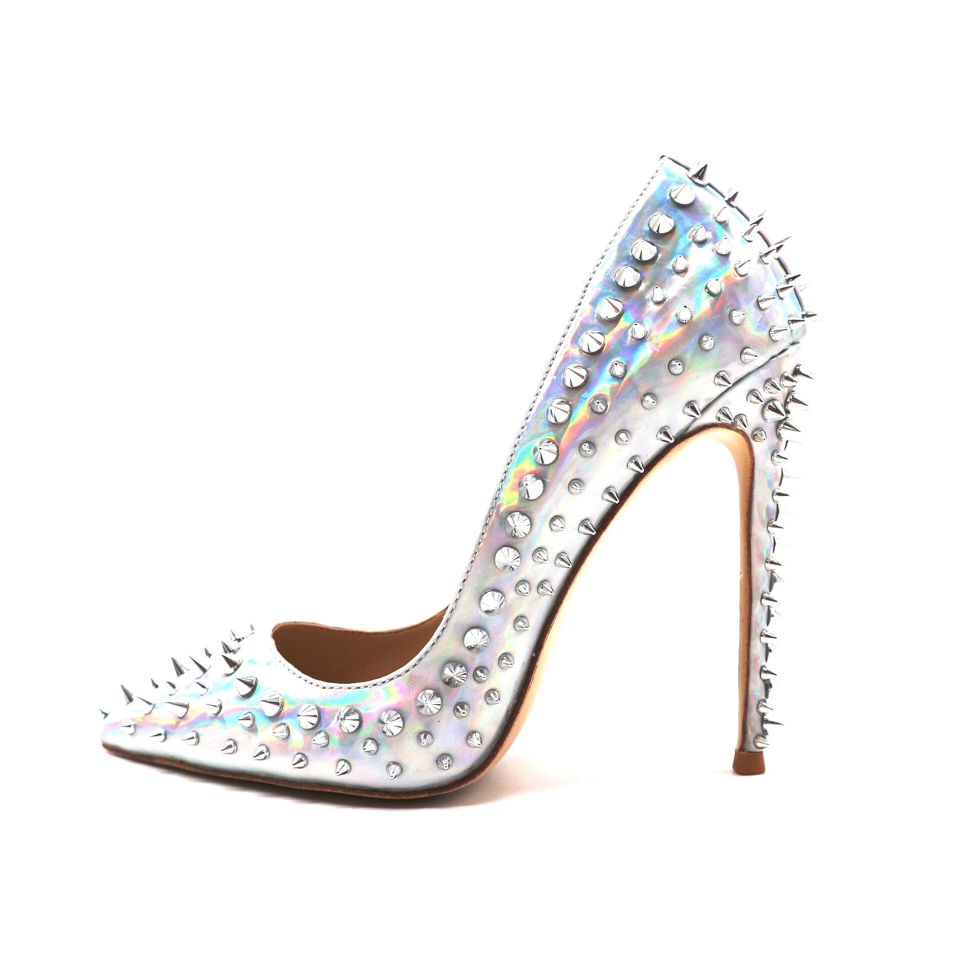 The iconic symbol of the Maison is the key feature of these leather pumps. The special treatment on the upper give a cameleon effect to the colour. This version is indeed encrusted with spikes. Genuine leather sole. Inner lining. Iron stiletto Heel. Heel: 120 mm.