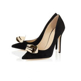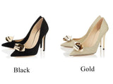 These classic velvet pumps feature a golden tie covered toecap. Laminated metal stiletto. Nappa footbed. Genuine leather sole. Heel: 120 mm