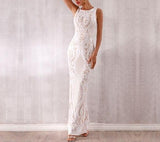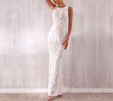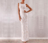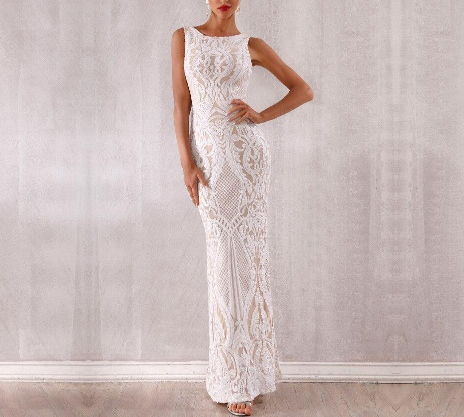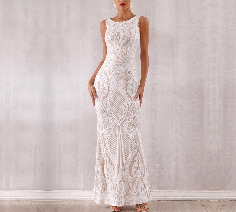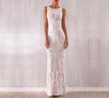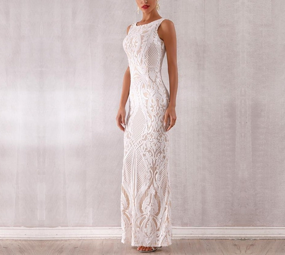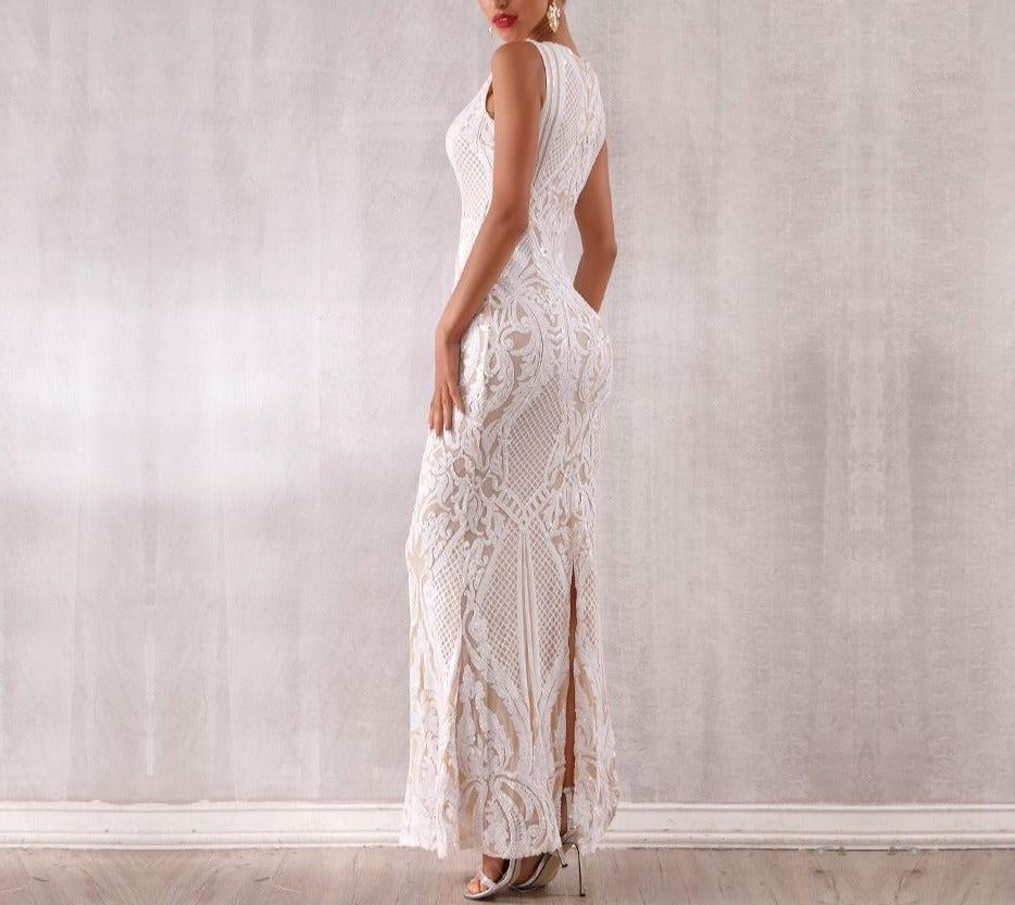 See-through elements and small plunge neckline are the main features of this stretch silk and lace crepe fishtail dress. Satin stripes covered in lace highlight the fit of the bustier that features tulle inserts. A high slit on the left. Zipper fastening at centre back that defines the fit.