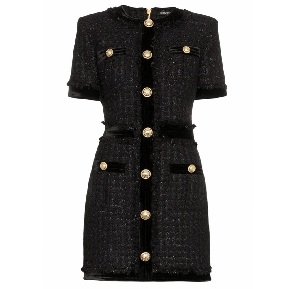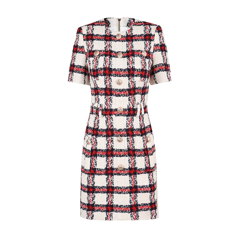 Medium dress with Jewel metal buttons. Regular Crew-Neck. Single reinforced needle stitching.
