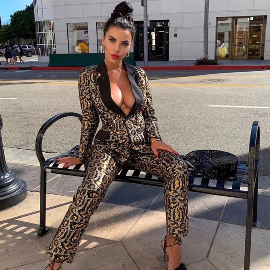 Hollywood divas’ glamour is back on this jersey and viscose cady jumpsuit. Plunge neckline and full-cut trousers. The unique design of the symmetrical black silk lapels contrasts the leopard printed design. Two flap black pockets on the blazer.
