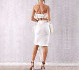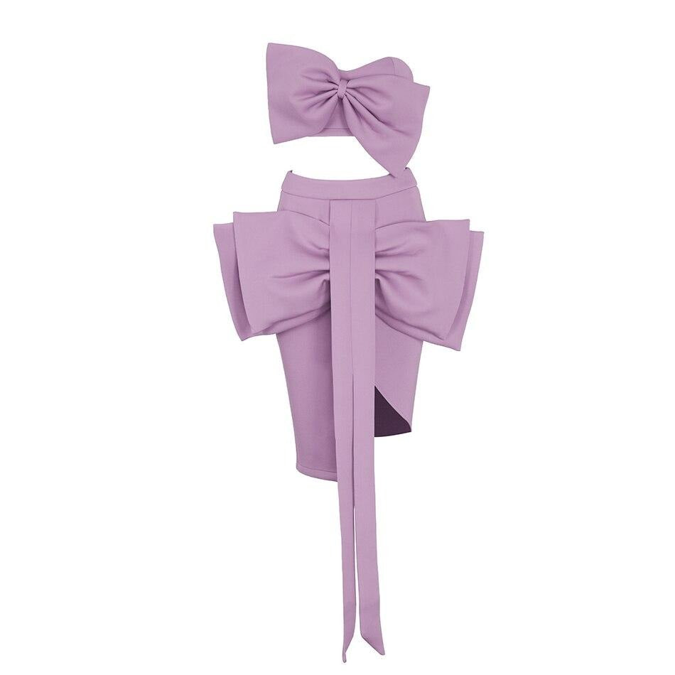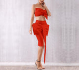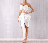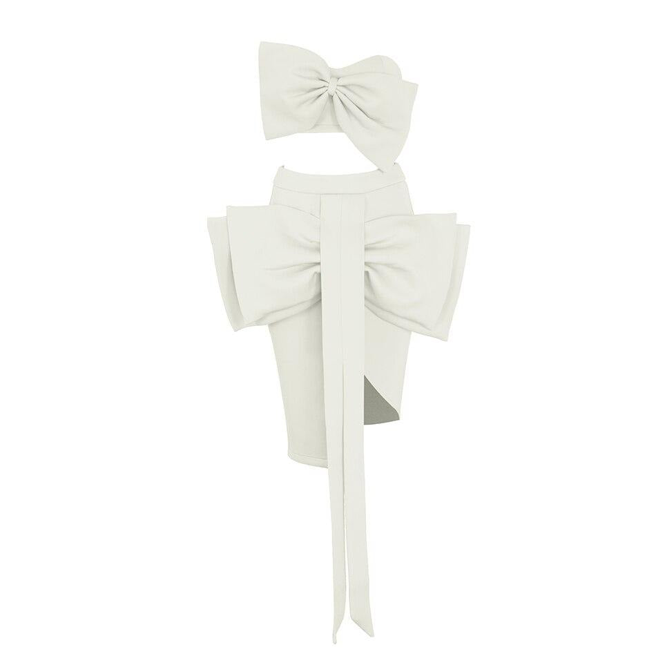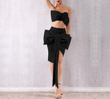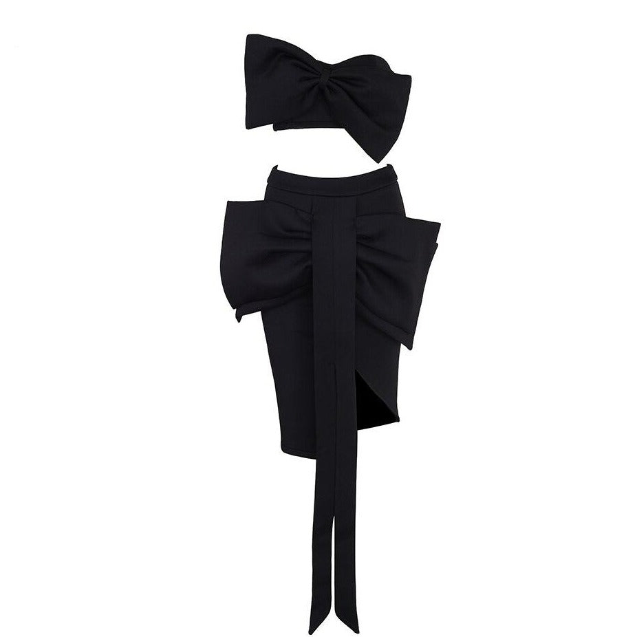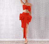 Hollywood divas’ glamour is back on this jersey and viscose cady jumpsuit set. Bandeau neckline and full-cut skirt. The unique design of the asymmetrical top featuring a jaw dropping large drape ribbon knot into a bowtie. Skirt asymmetrical featuring large drape bowtie knot and long falling drape.