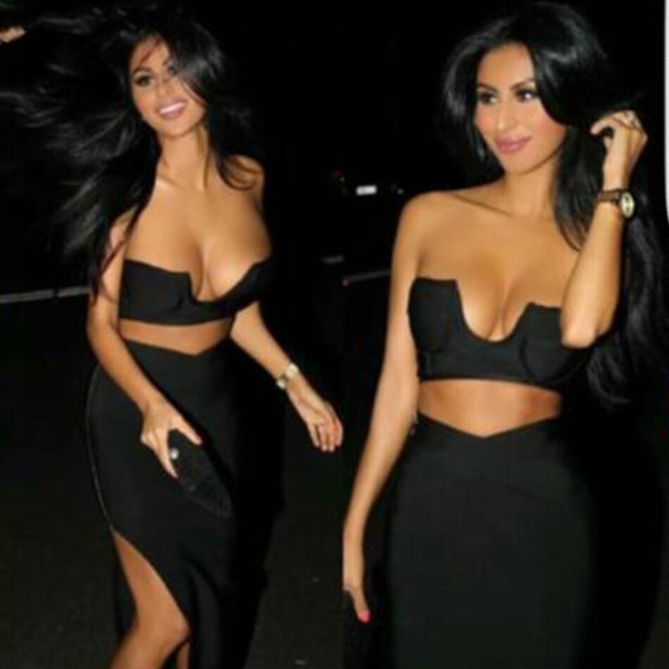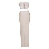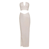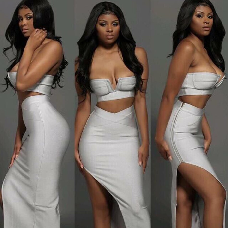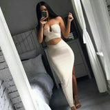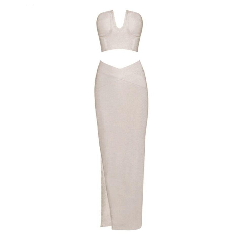 The simple lines of this viscose two-piece dress are brightened up by the the slit opening on the right thigh that enhances the sexy yet elegant look of the skirt. A plunge neckline defines this stretch halter dress. Bandeau top. Both the top and the skirt feature ribbed hems.