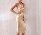 The simple lines of this latex viscose two-piece dress are brightened up by the the asymmetrical look of the shoulder straps. A plunge neckline defines this stretch halter dress covered in jacquard woven threads. Button fastening collar. Zipper fastening at centre back. The brand's logo is sewn on and the left front side of the skirt has a slit opening that goes mid thigh. Both the top and the skirt feature ribbed hems. Large opening on the back.