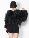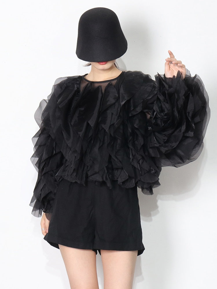 It's the magic of stretch silk satin with its brightness that makes this shirt extremely sophisticated. Chiffons and pleats define this unique design.