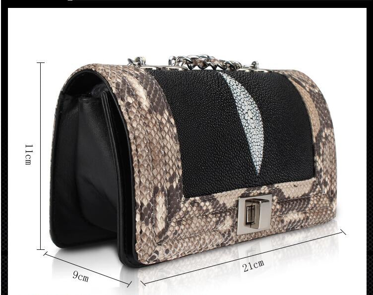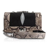 The Maison's dark elegance is the key feature of this genuine python and stingray bag with rotating metal closure on the top flap. It has a detachable metal shoulder strap. The inside is fully lined and features a mirror and a ""You look great today"" embroidery. You will not find two bags the same due to the natures of the exotic genuine leather and their differences among different animals. Measures: h cm 12, w cm 24, d cm 9.