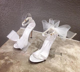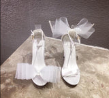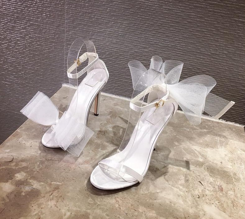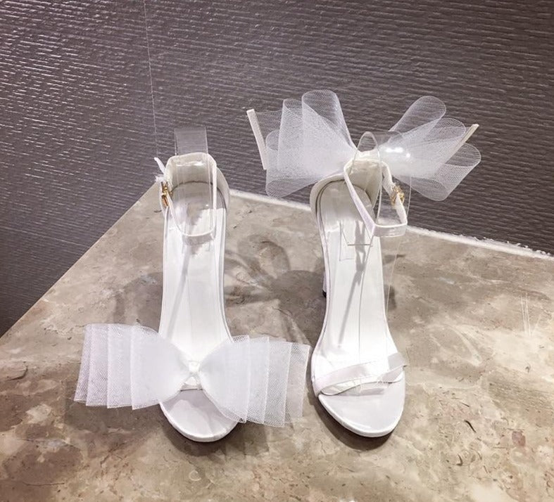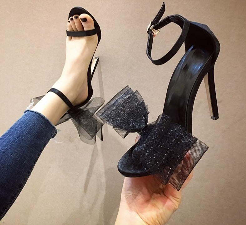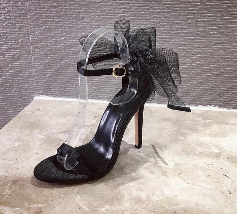 Lace and silk patent strap sandals. Buckle ankle strap. A jewel decoration on the stiletto heels. Dappled footbed. Silk ribbon tie on toe. Heel: 120 mm.