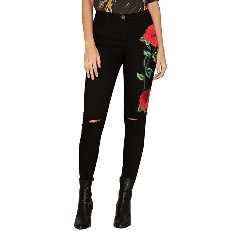 All-over Roses decorations with distressed add-ons are the distinctive feature of these stretch stone washed denim 5 pocket jeggings. Single metal jewel button fastening. The iconic hexagonal logo is sewn on the rear right pocket. Bottom: 28 cm. Fit: High Waist.