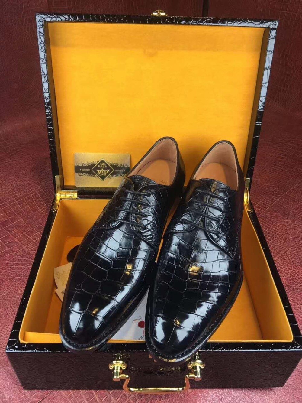 The classic brushed genuine crocodile lace-up Oxfords are lightened up by the leather shoe laces too. Genuine leather sole. Genuine leather inner lining.