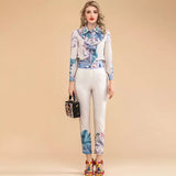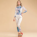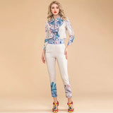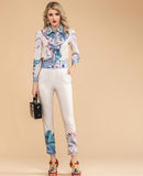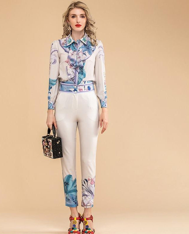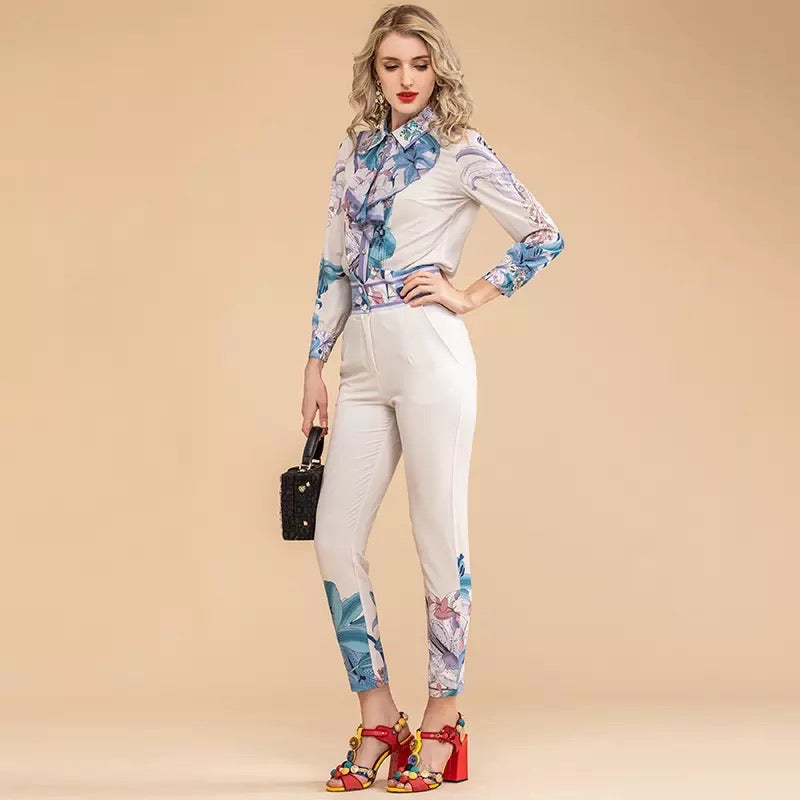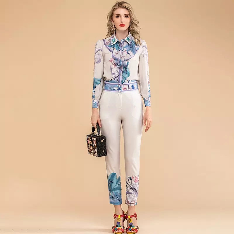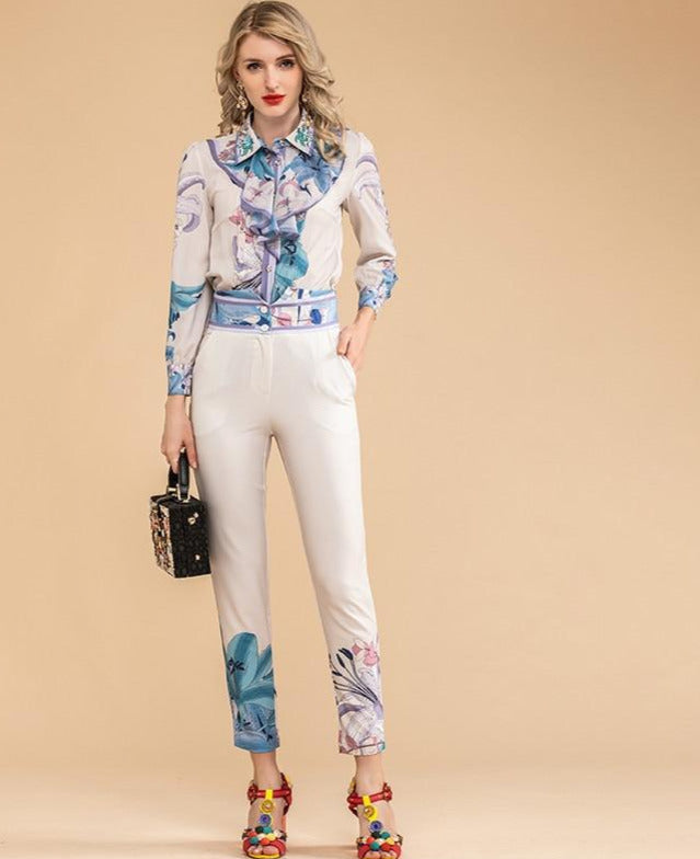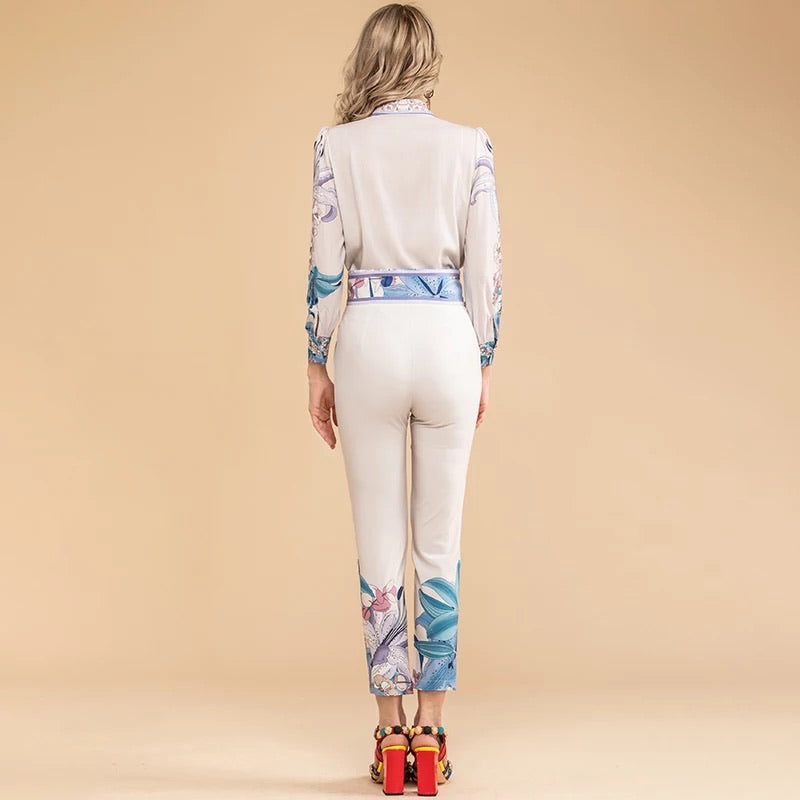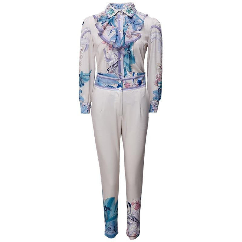 Cotton short long sleeves jumpsuit. Banded waist. Two needle stitching. Floreal embroideries thoughout the 2 pieces set. Lace embroideries on plunge V-shape neckline.