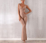 Dappled long evening halter dress. Hollowed and straight drape. The waist is highlighted by an engulfing tight design. Straight pants with a straight fit. Concealed zipper fastening at centre back. Body lining.