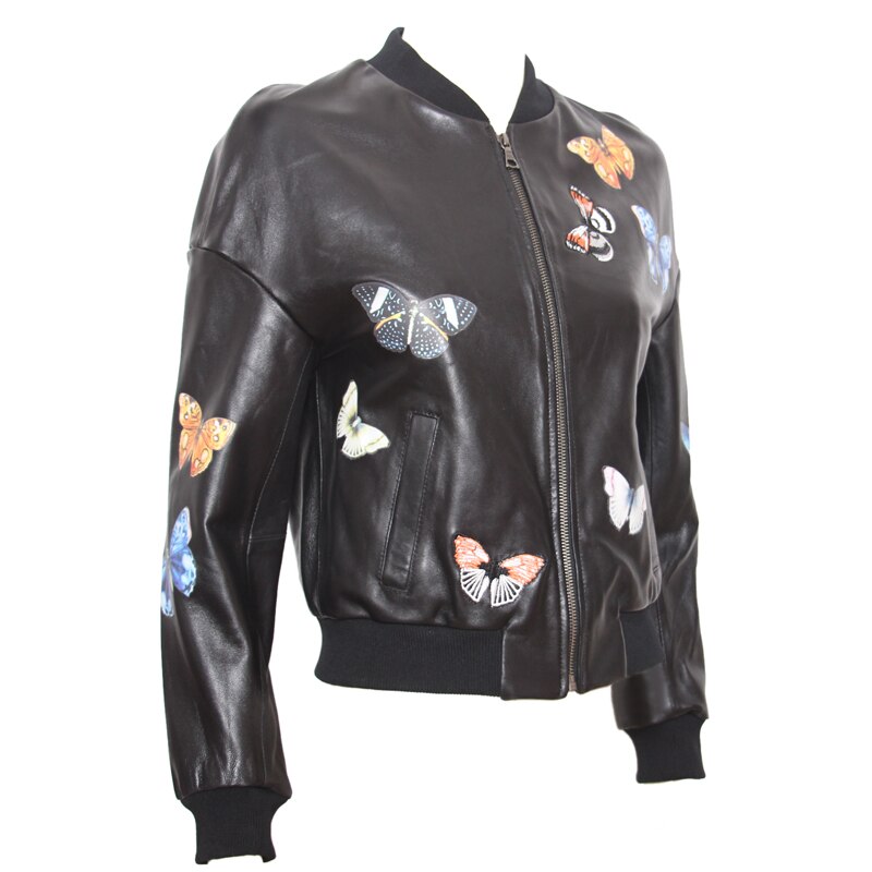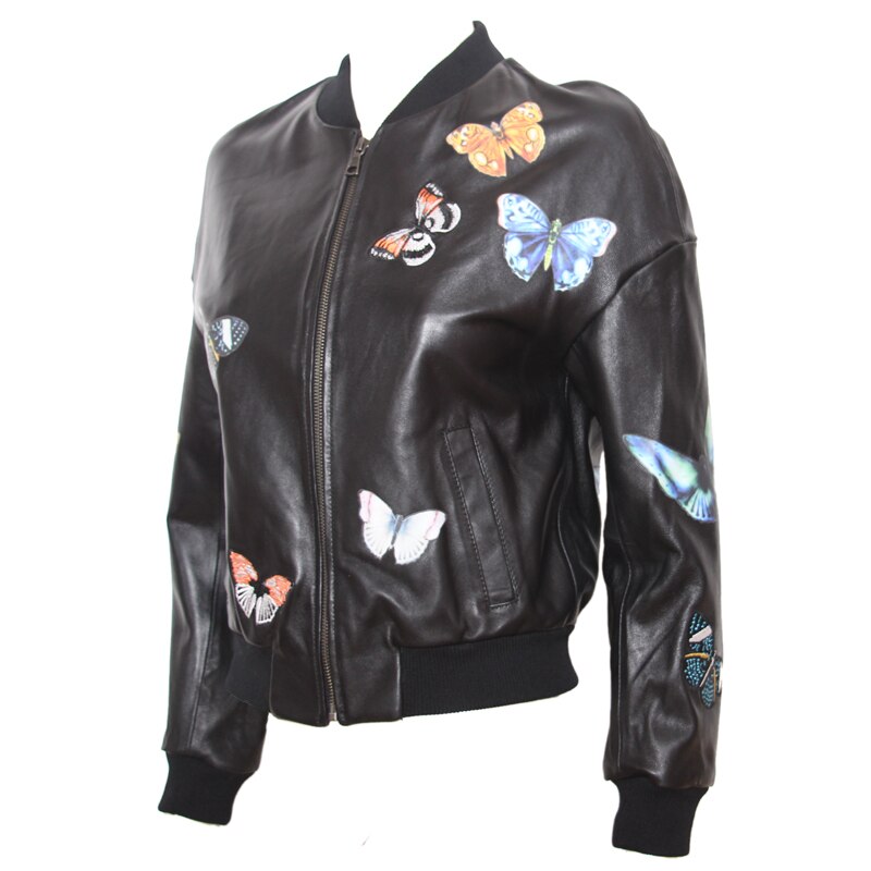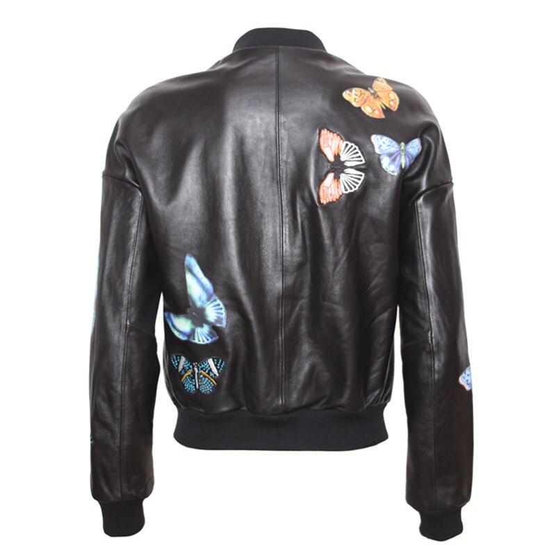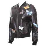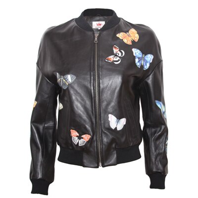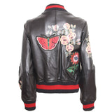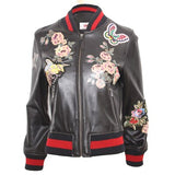 Leather perfecto with Floreal-style decorations throughout the jacket. Zippers on main opening, sleeves, pockets and as decoration. Satin lining. Wool ribs on waist, neckline and cuffs