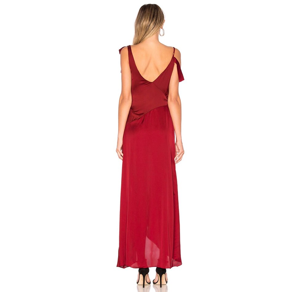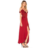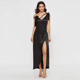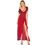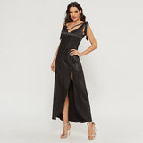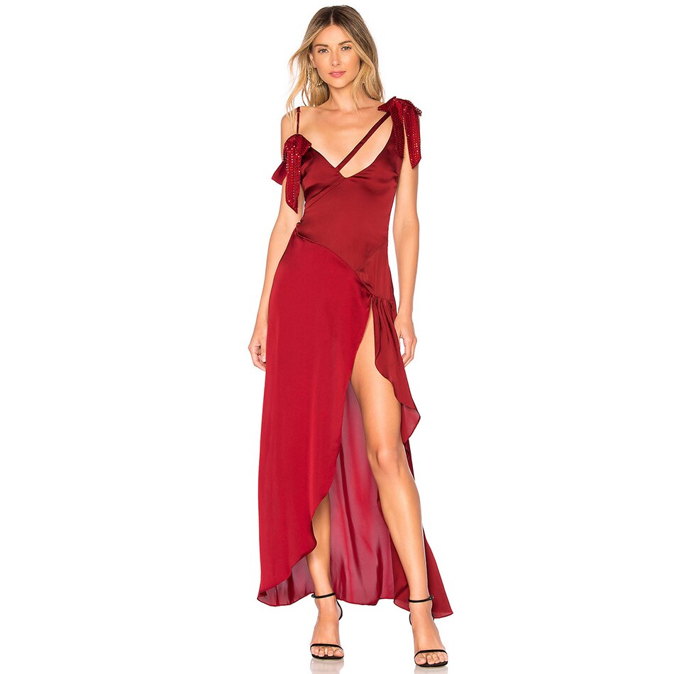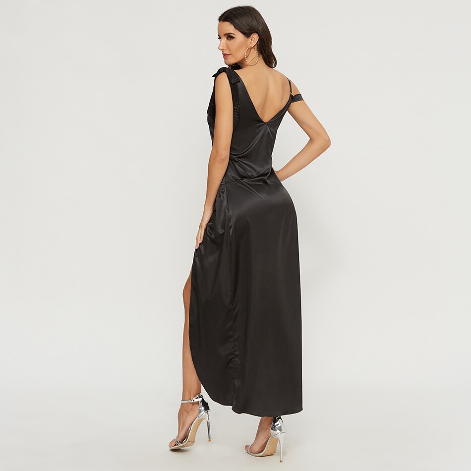 1980's glam is featured on this long dress covered in crystals with padded shoulders and gentle draping halted at waist. Deep plunge V-neckline and high slit on the left.