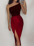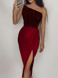 Dappled long evening single shoulder halter dress with Hollowed and straight drape at low neckline. The waist is highlighted by an engulfing tight design. Straight skirt with a high side slit. Concealed zipper fastening at centre back. Body lining. Sequin enriched top. Velvet like skirt.