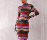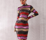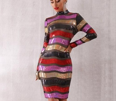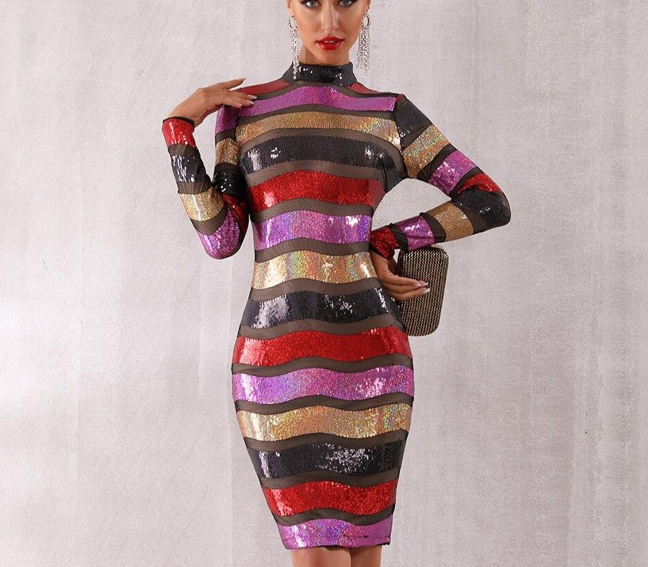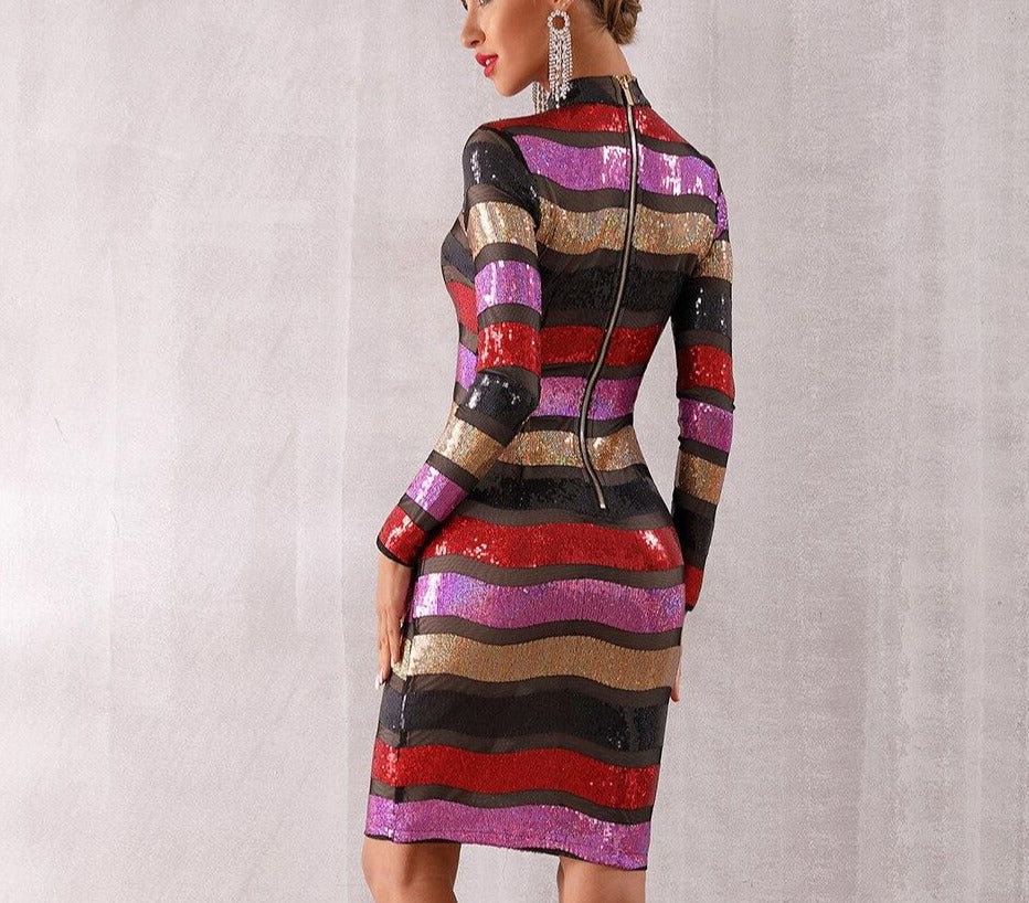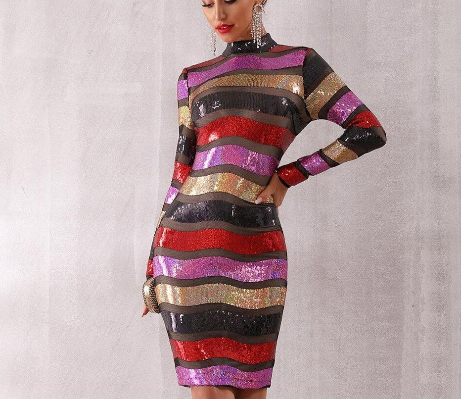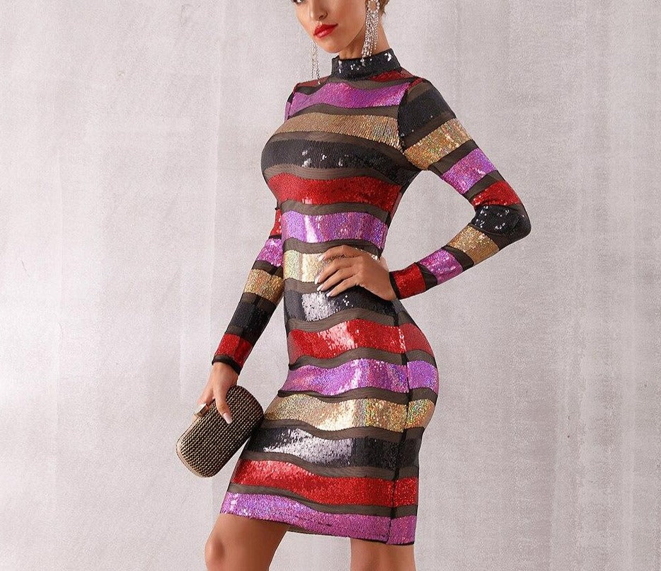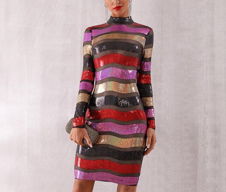 The 70’s glam is concentrated on this sequin dress decorated with lighting bolt graphics, recalling Ziggy Stardust, and the brand’s lettering. Plunge neckline. Zipper fastening at centre back.