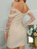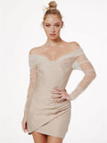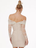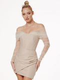 Pleat and fold work enriched stretch viscose jersey evening dress. Symmetrical neckline with decorative bra. Central pleated drape. pleated skirt. Zipper fastening at centre back. Lace sleeves.