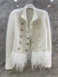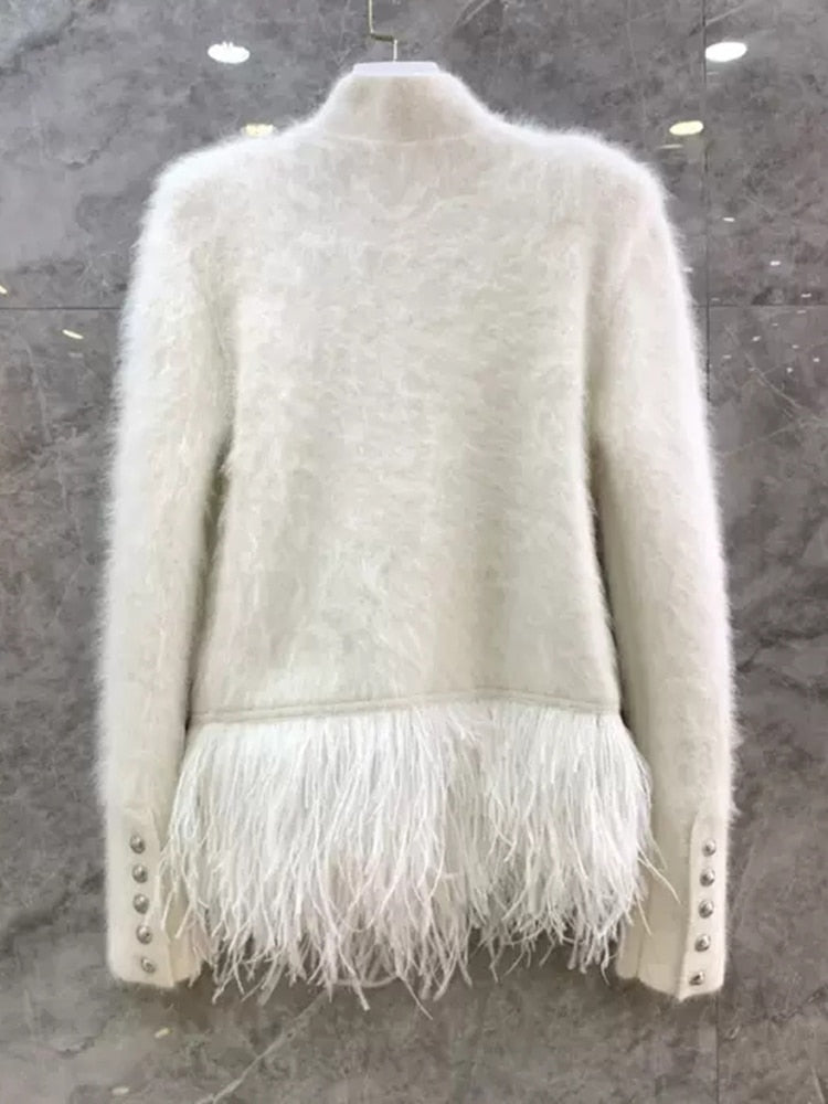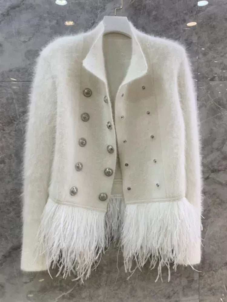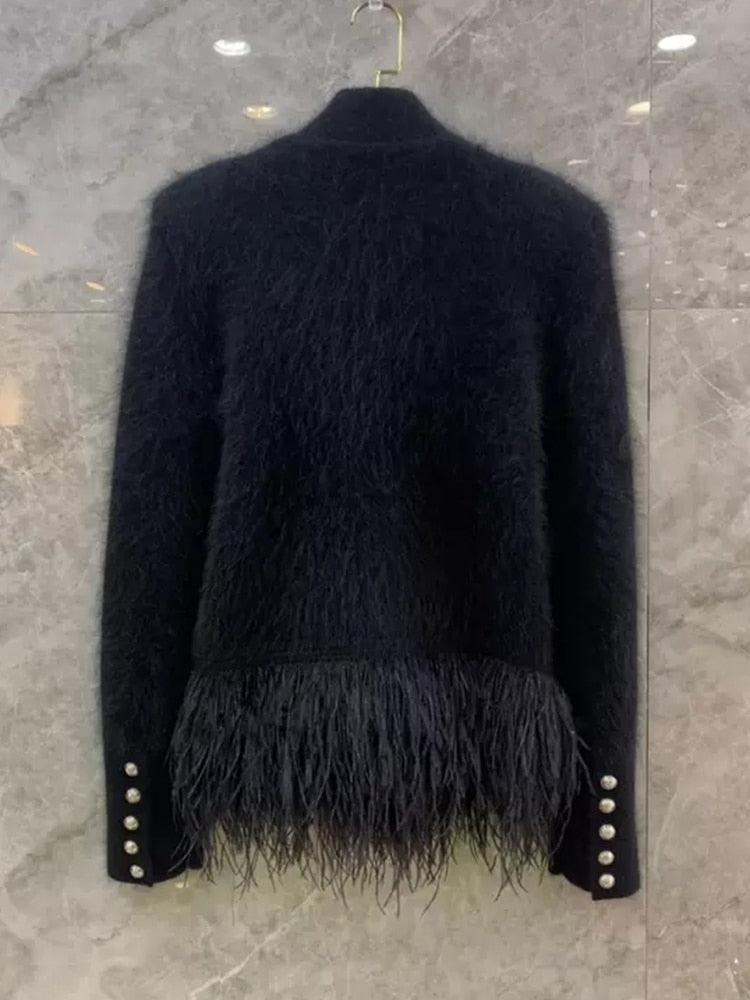 Double-breasted jacket. Korean overlapping neck collar. Long cuff enriched with metal buttons. Feathers on the bottom hem.