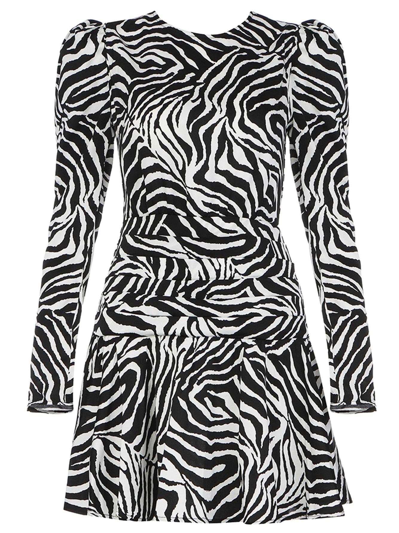 Simple and stylish zebra stretch viscose jersey evening dress. Symmetrical neckline with decorative bra. Central pleated drape. pleated skirt. Zipper fastening at centre back. Long sleeves.