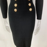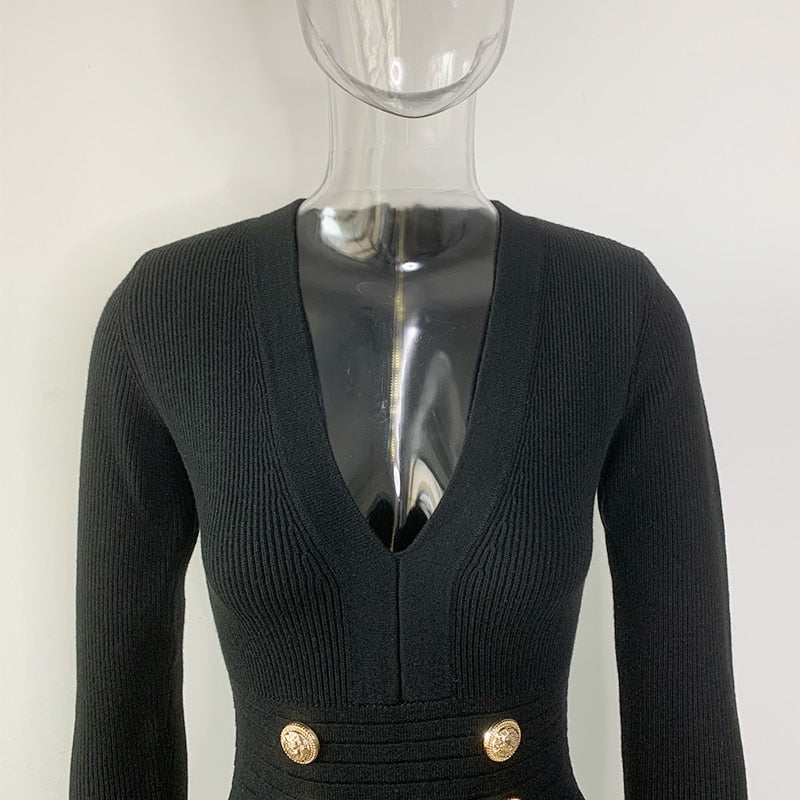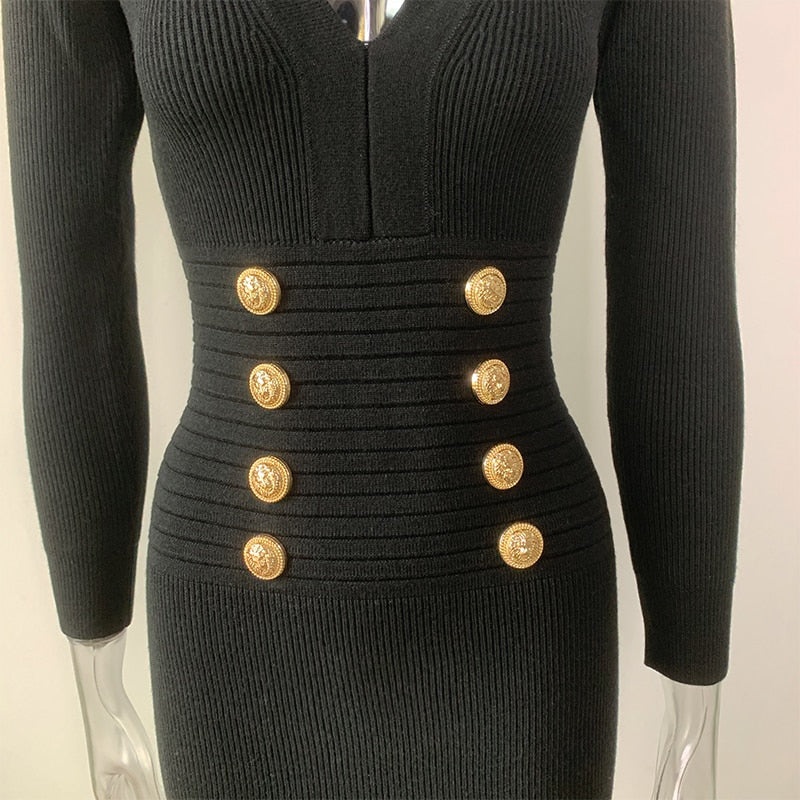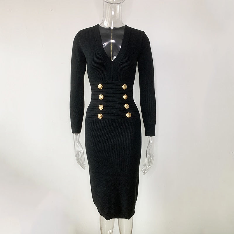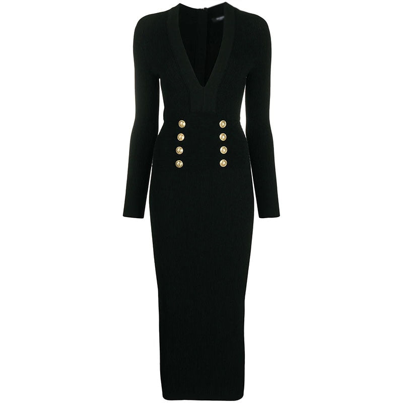 long dress with Jewel metal buttons.Deep V-Neck opening. Single reinforced needle stitching.