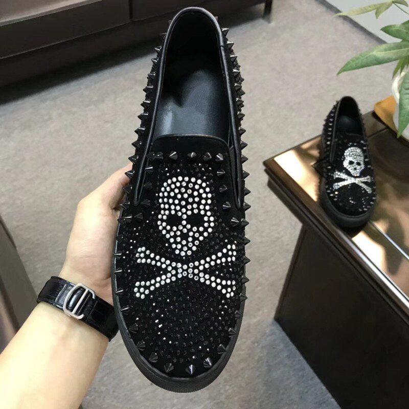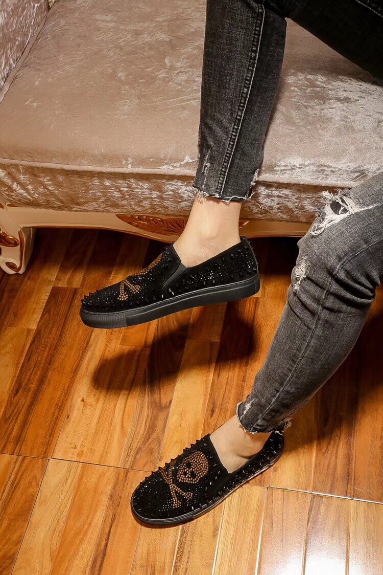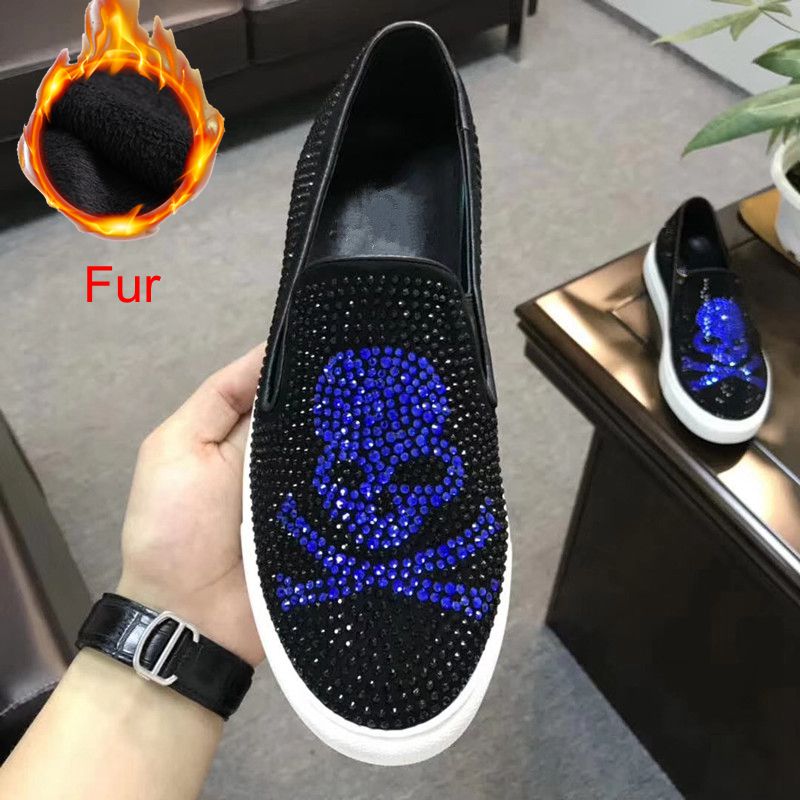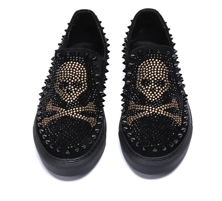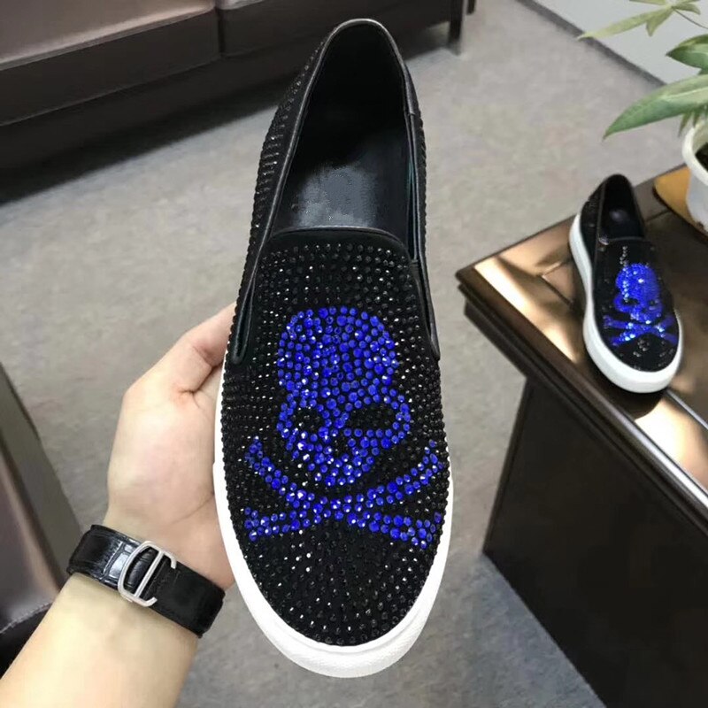 Between a sneaker and a boat shoe, the Crystal Skulls perfectly combine sophistication and ease. Mounted on a white or blackanti-slide rubber sole, they are made of navy python with a satiny finish and lined with spikes. They have side elastics on the vamp and a tone-on-tone grosgrain finish.<p>