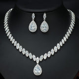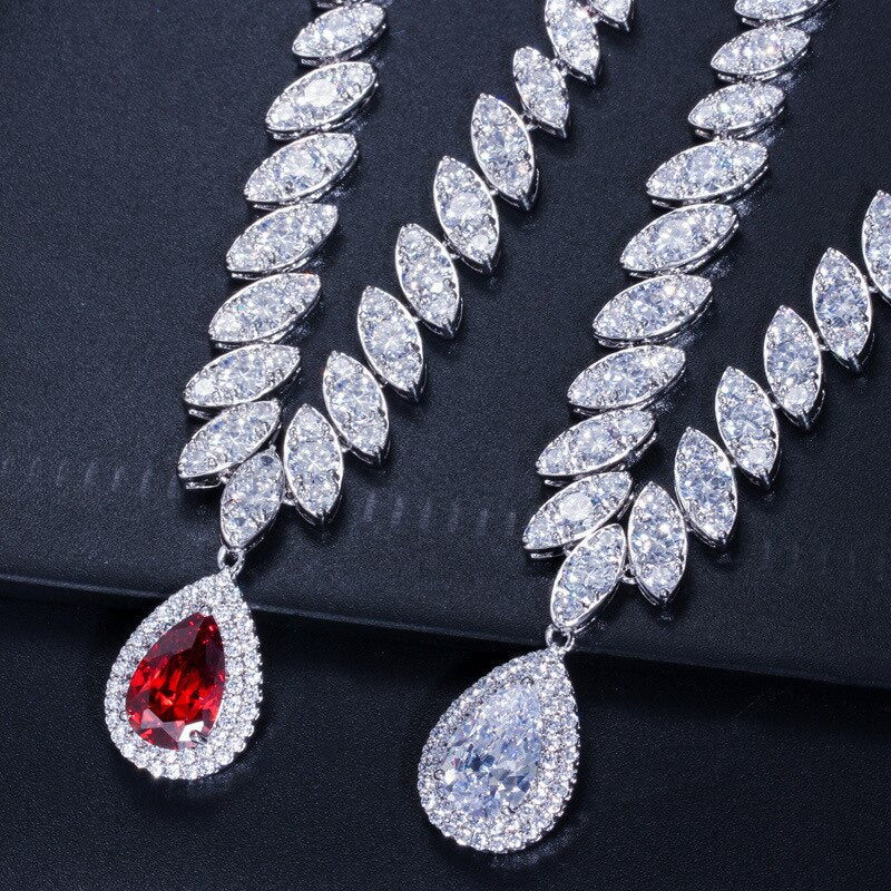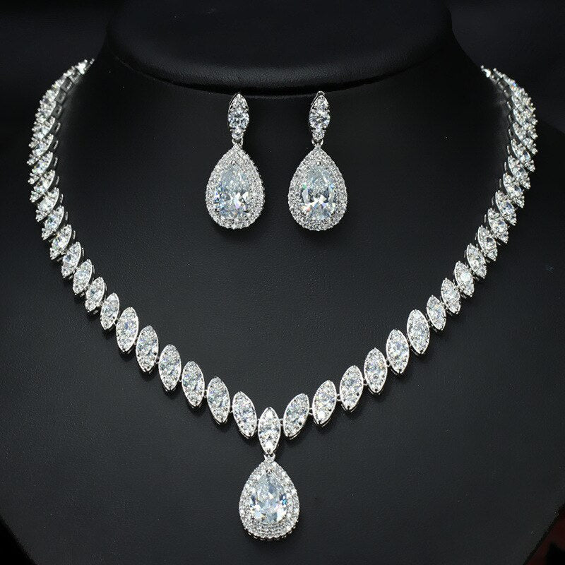 Elegant drop down earrings, necklace with amazing shine. These stunning drop down earrings feature graduating stones and ends in a brilliant cut stone. They are made out of genuine 925 sterling silver, finished with a layer of rhodium to reduce tarnishing and give it the deep shine of white gold jewelry.