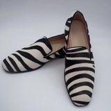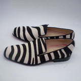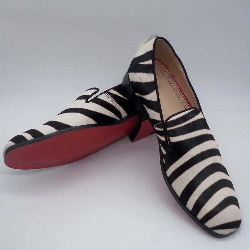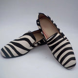 These calfskin leafers feature the top horse hair skin, and a zebra pattern typical of the collection King of the Jungle. Metal badge on the heel. Leather sole. Leather lining.