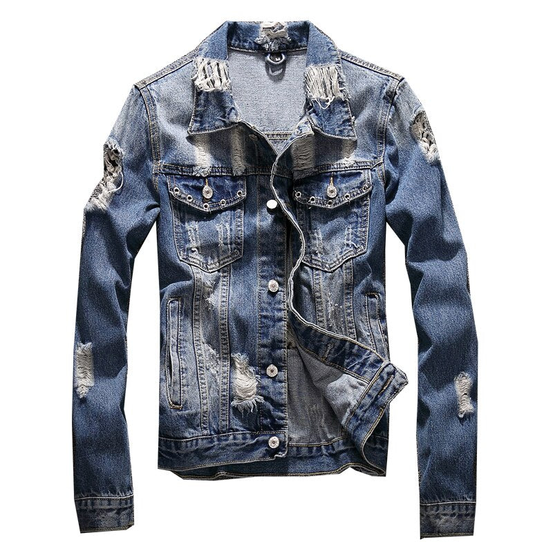 The classic worker jacket gets a brand new look in this stone washed denim version with a distressed look. Several cuts and tears make this garment unique. All the rest remains unchanged: shirt collar, buttoning, two patch pockets with flap and two slit ones. Buttoning cuffs.
