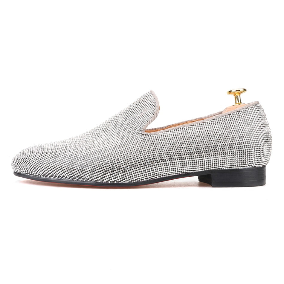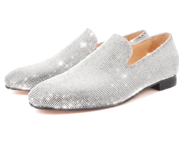 For all your special events these calfskin moccasins are decorated with the best available crystals painstakingly hand set. Leather piping on hems. A metal badge with the brand's lettering on the heel. Genuine leather sole. Leather lining.