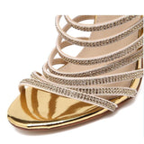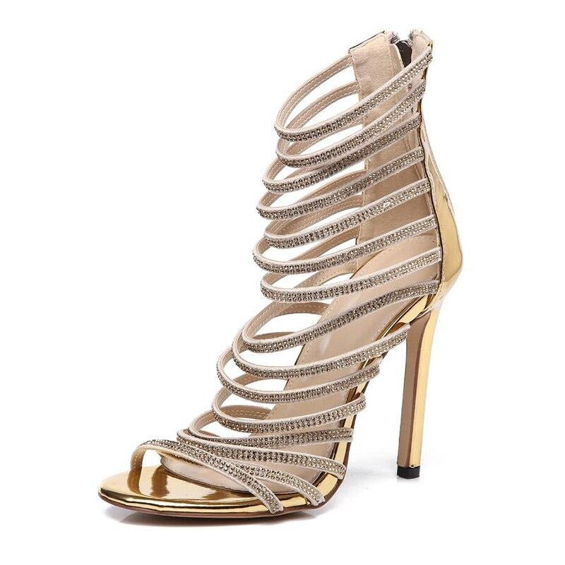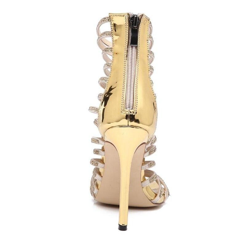 Patent strap sandals. Crystals buckle ankle straps. A jewel decoration on the stiletto heels. Dappled footbed. Crystal enriched laces. Heel: 120 mm.