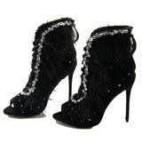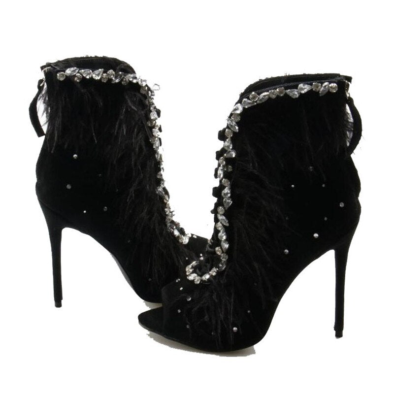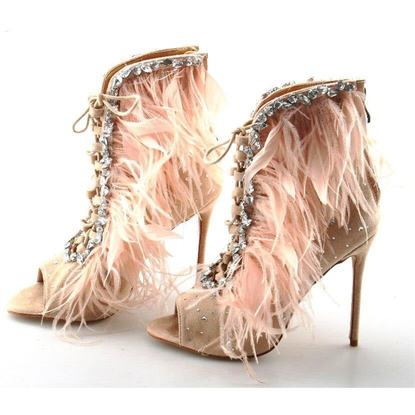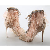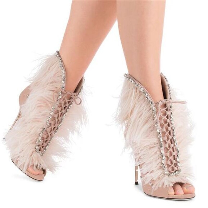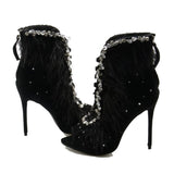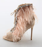 The Tied up ankle boot plays with nappa leather. Mounted on a 100 mm heel, this Maison Pisani Maura model shouts elegance with its open toe and lace-up front closure.Leather open toe ankle heels boots. Ribbon decoration. Feathered and swaroski crystals embedded seams. Opened Toe caps. Crossed frontal laces fastening. Stiletto heels. Leather sole.