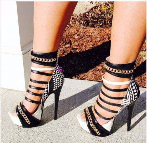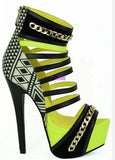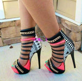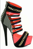 The ankle-high gladiator sandals are the perfect match for hot-pants, miniskirts and a lot of different outfits. This multicolour Leather version features stud decoration on all the straps. Concealed zipper fastening at counter heel. Nappa footbed with logo. Suede lined stiletto heel. Leather sole. Heel: 100 mm.