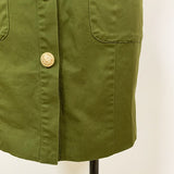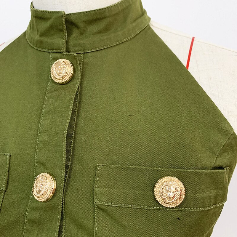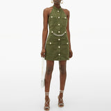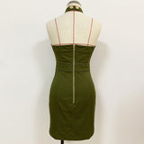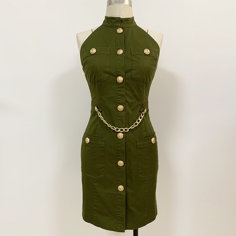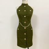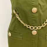 The 1970’s glam is featured on this green beret dress. Plunge back and hook fastening neckband. Tight fitting bodice and soft and wide skirt. Zipper fastening at centre back. Decorative frontal chain.