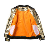 This nylon bomber features a golden, silver or black finish to bedazzle. Zipper fastening. Two slit pockets. Woven ribbed collar, cuffs and bottom hem. Inner lining.