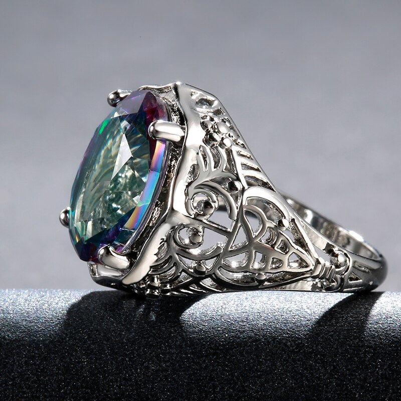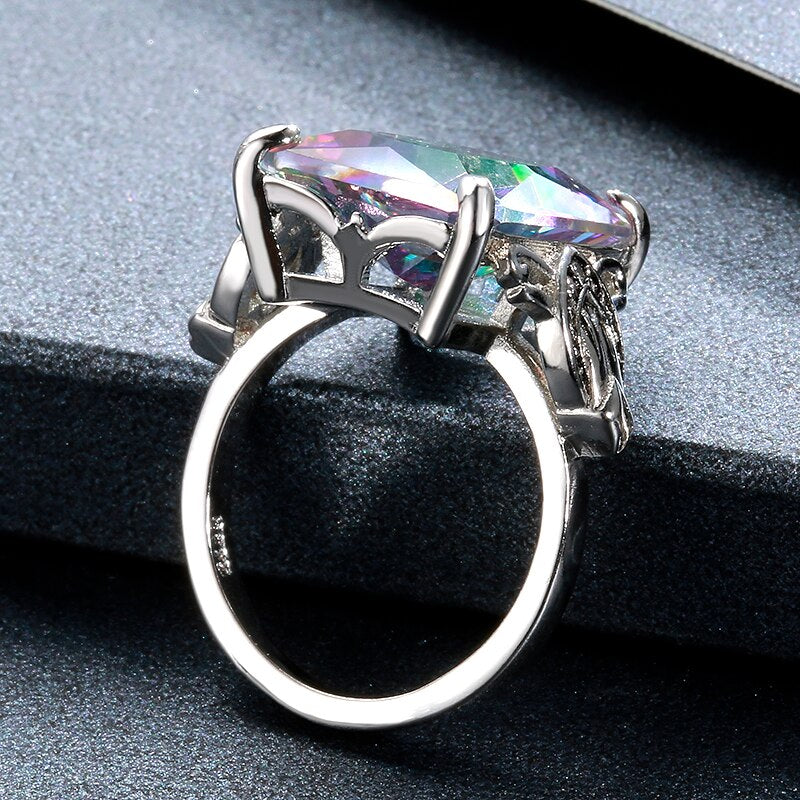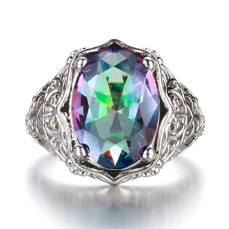 This oversized statement piece features 14mm x 14mm oval cut flawless stones prong set on a 3.5mm thick band. This is a great fashion piece that looks good dressed up or down. This beautiful ring gives you the same look of white gold and diamonds at a fraction of the cost. The stones are 5A flawless moissonite, which sparkle with incredible fire and brilliance. They are all individually hand set by experienced master jewelers. The ring is made out of genuine 925 sterling silver. Just like white gold jewelry, the metal has a lustrous rhodium top layer which protects it from tarnish.