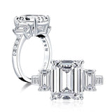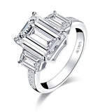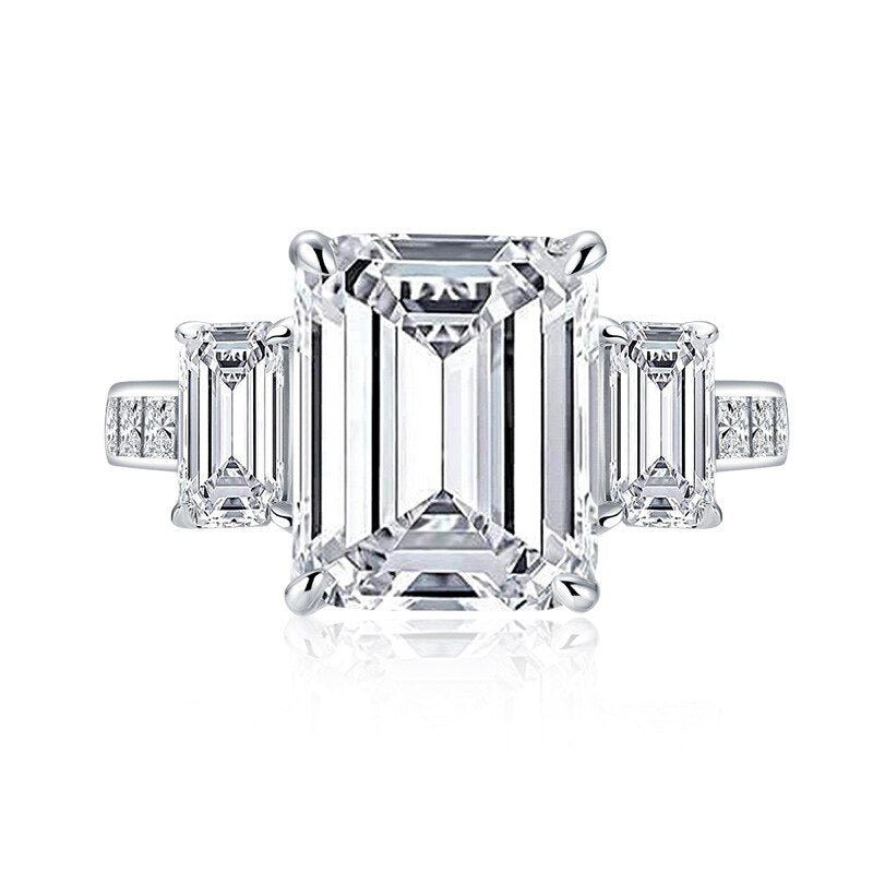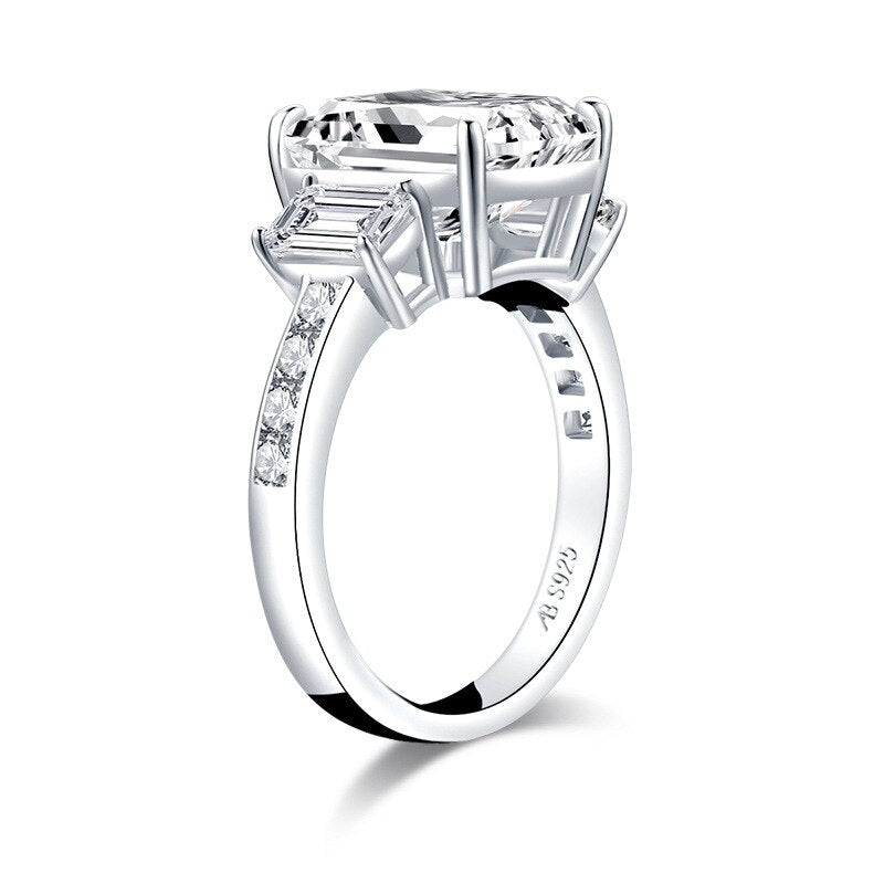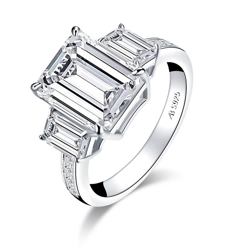 This stunning ring replicates a $14,500 look with a 3 carat emerald cut flawless center stone, and trapezoid baguette cut side stones. This amazing timeless ring is a perfect addition for your collection and serves well as an engagement ring as well. This beautiful ring gives you the same look of white gold and diamonds at a fraction of the cost. The stones are flawless moissonite, which sparkle with incredible fire and brilliance. They are all individually hand set by experienced master jewelers. The ring is made out of genuine 925 sterling silver. Just like white gold jewelry, the metal has a lustrous rhodium top layer which protects it from tarnish.